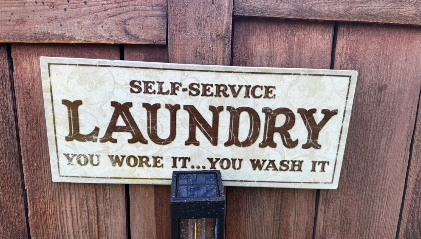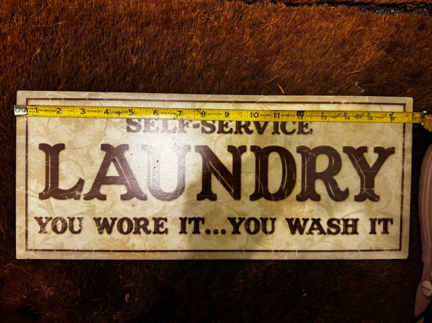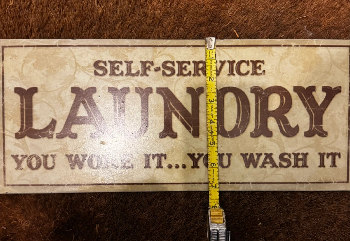 Here's a cute "Self-Service Laundry, You Wore It...You Wash It" sign for your laundry room. It's in great condition and ready to add some charm to your space! The sign measures approximately 17 inches in length and 5 inches in height. Bought at HomeGoods.