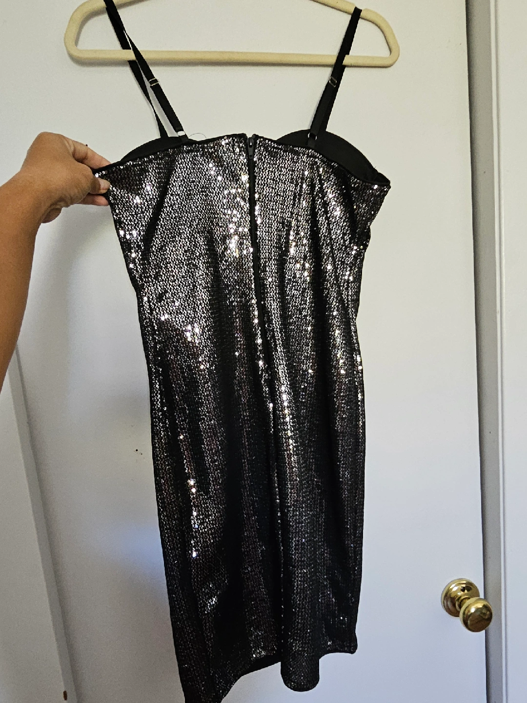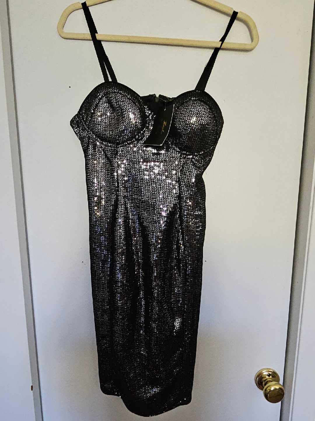 Selling a fun and sparkly sequin bodycon dress! The dress is black and silver and is a size L. Perfect for a night out!