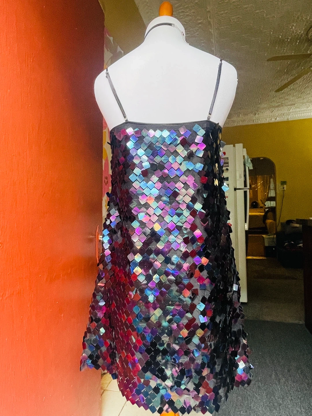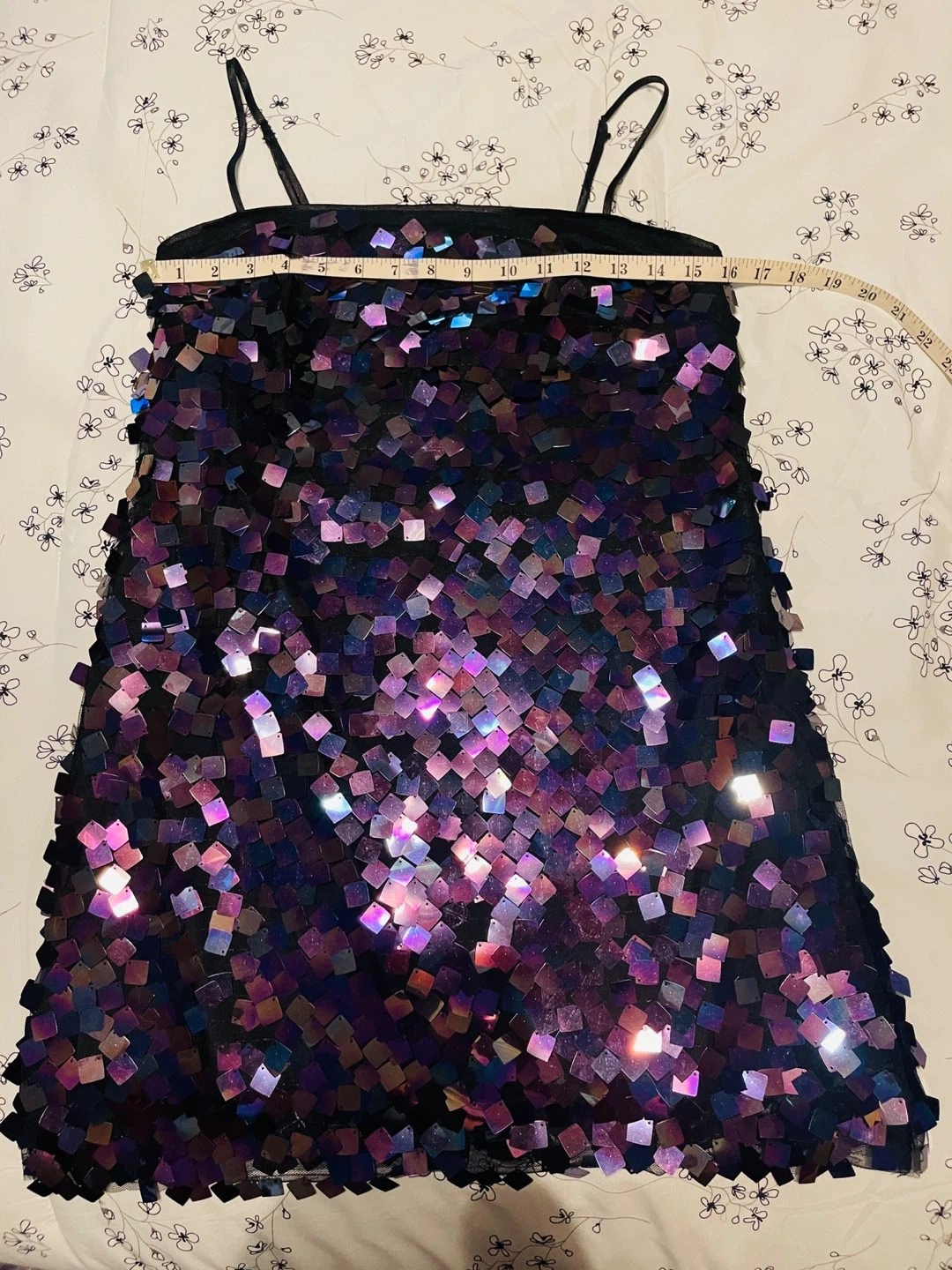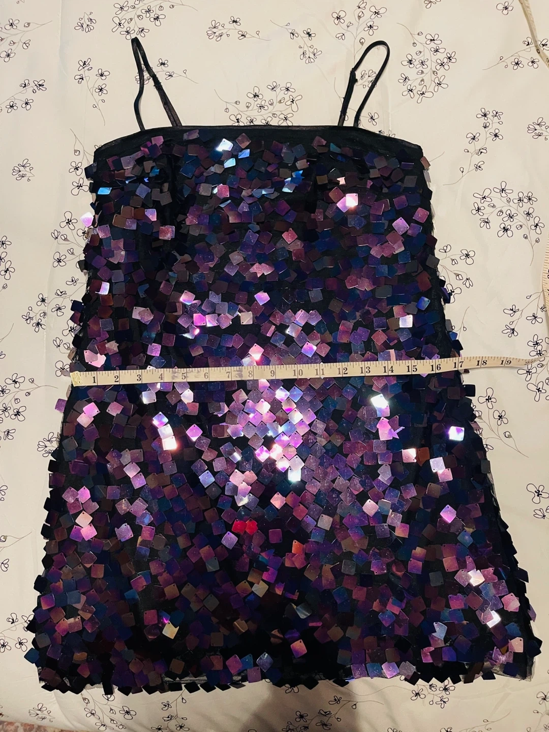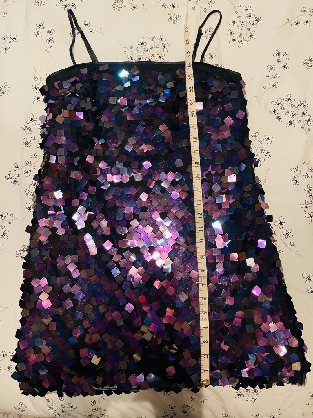 26This fun sequin mini dress is perfect for a night out or a special occasion! The sequins catch the light beautifully, creating a dazzling effect. It measures about 33 inches in length. Add some sparkle to your wardrobe!