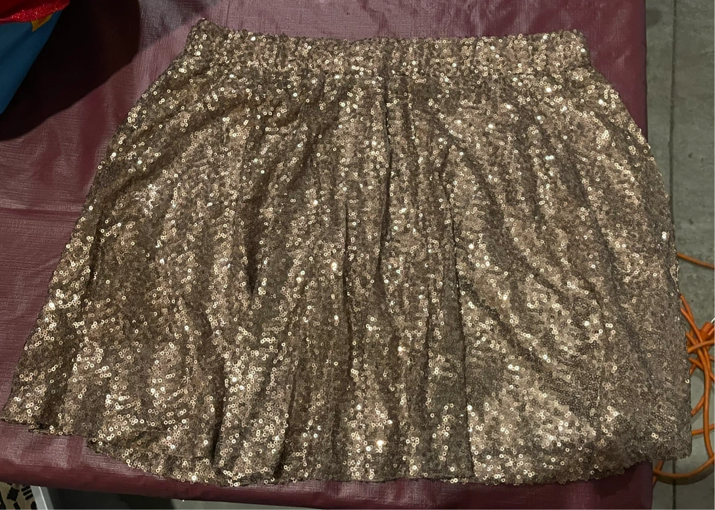 Here's a fun sequin mini skirt! It's gold, great for a party or night out. Size Large