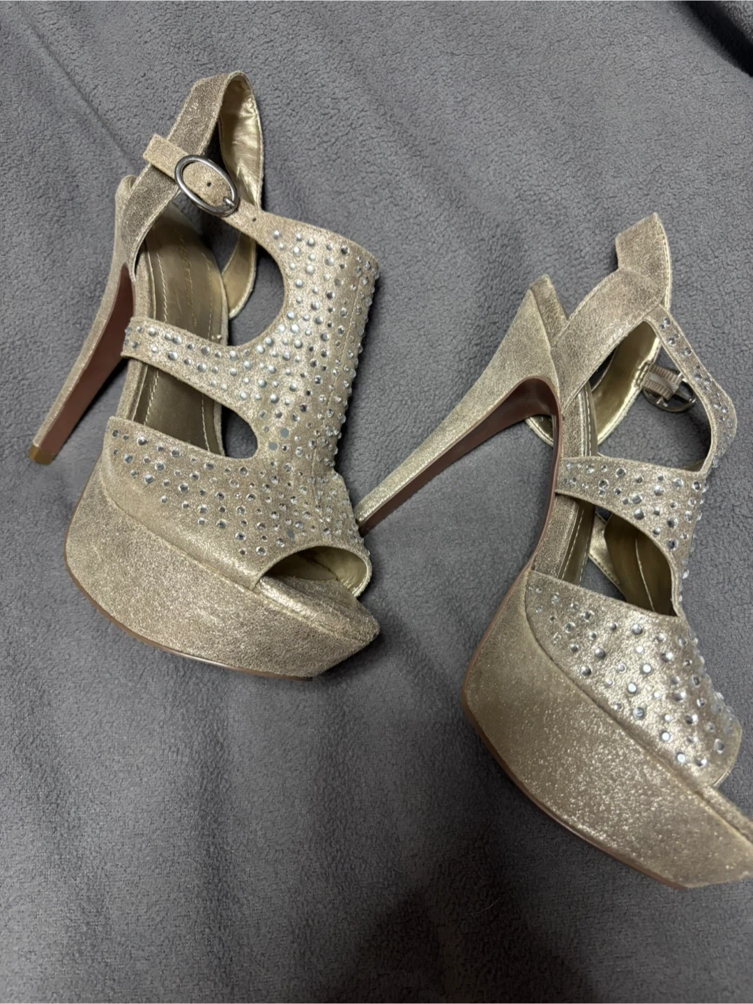 These dazzling BCBGeneration heels feature a glittering gold finish embellished with rhinestones. They have a secure ankle strap and a comfortable platform sole. Perfect for a night out or special occasion!