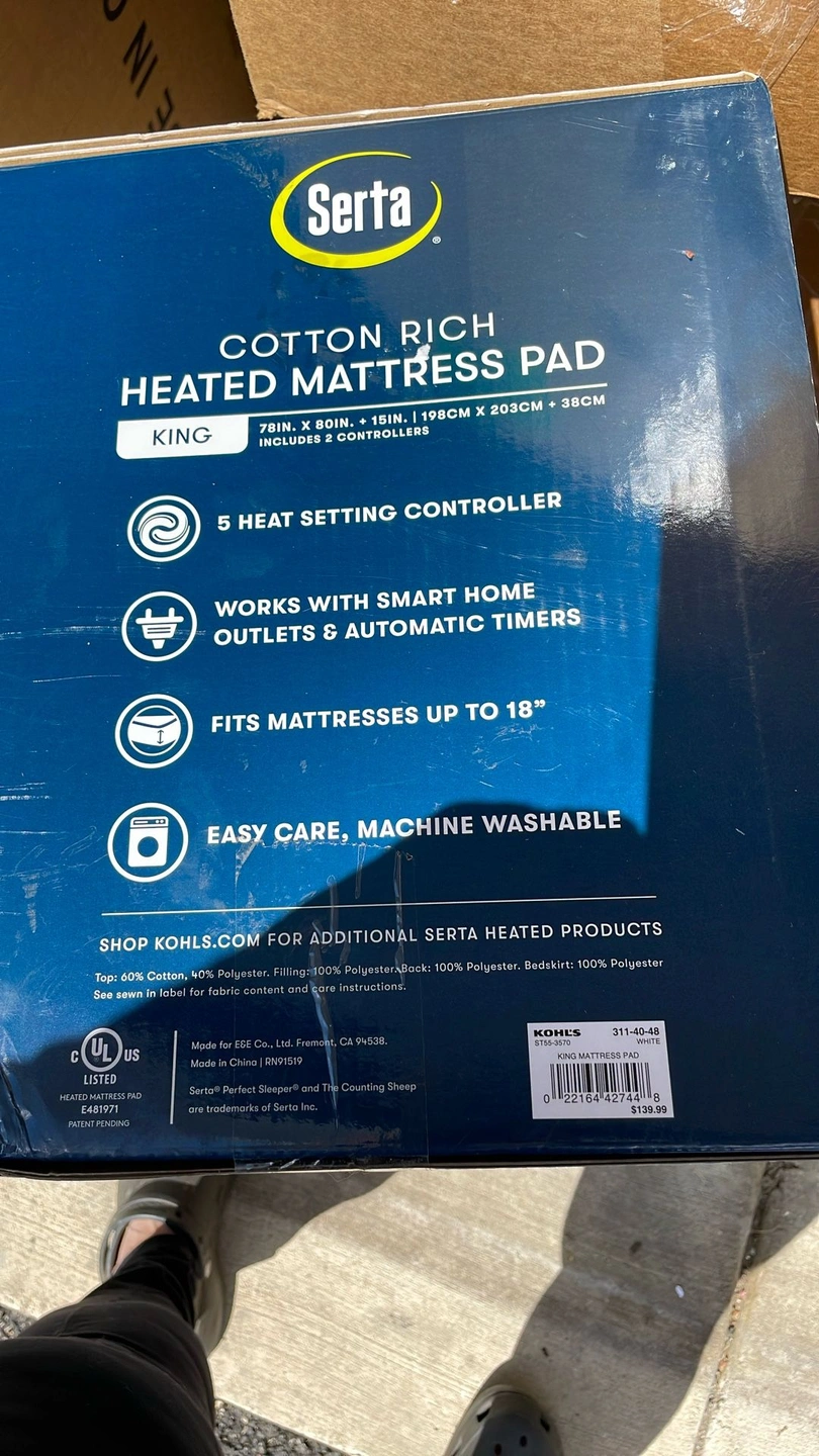 70This was a store return and does not appear to have been taken out of the box. Five heat settings Two controllers Easy care Machine washable Fits mattresses up to 18 inches Works with smart home outlets and automatic timers Pick up in Joliet near McWethys Size: King Color: White Material: Cotton Rich Type: Pillow tops & Mattress pads Brand: Serta