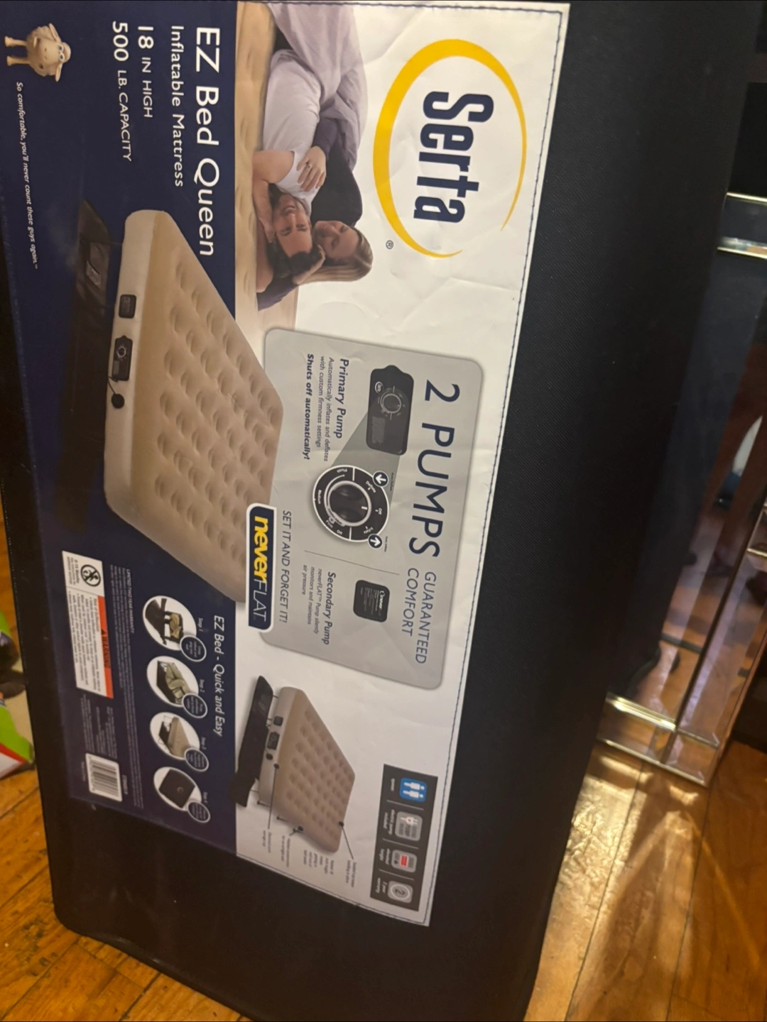 Selling a Serta EZ Bed Queen inflatable mattress! It features two pumps for guaranteed comfort. The primary pump automatically inflates and deflates with custom firmness settings, and it shuts off automatically. The secondary neverFLAT pump silently monitors and maintains air pressure, so you can set it and forget it! It's quick and easy to set up.