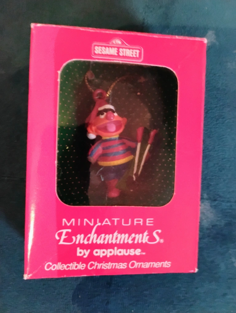 Selling a vintage Sesame Street Ernie miniature Christmas ornament by Applause! It's still in its original box and ready to add some nostalgic charm to your holiday decorations