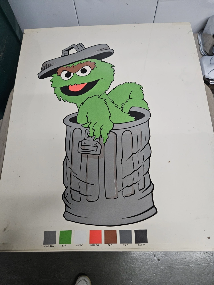 Original artwork featuring Oscar the Grouch in a trash can. Comes with color swatches.