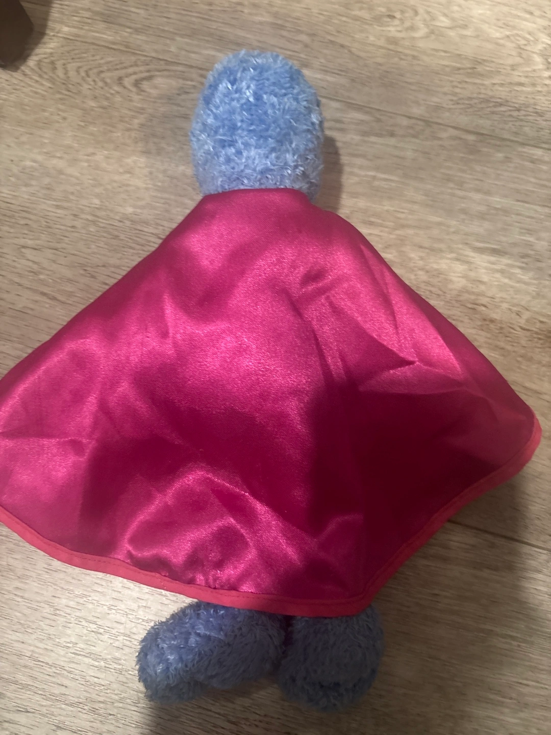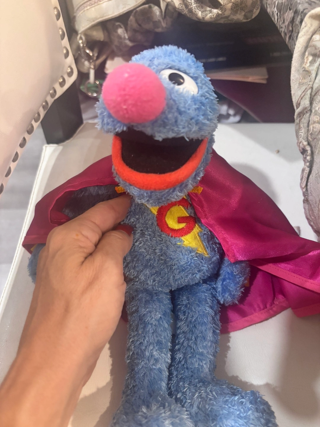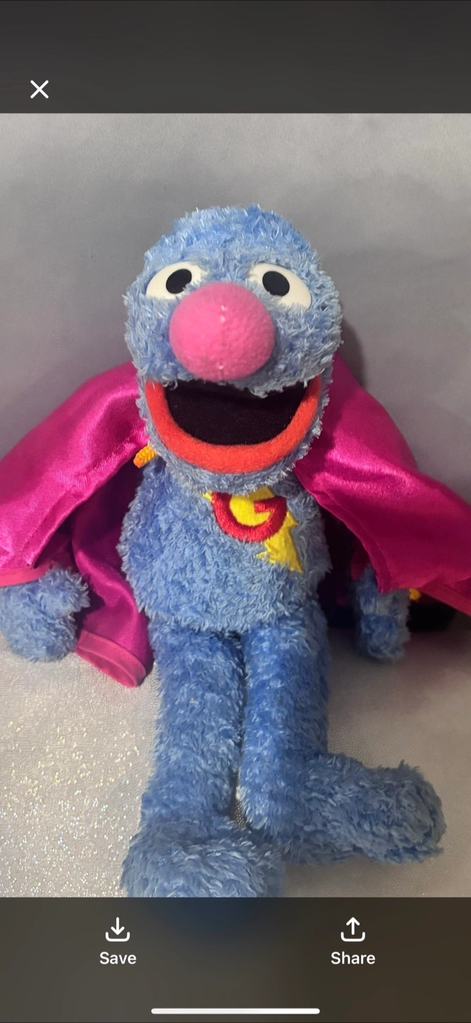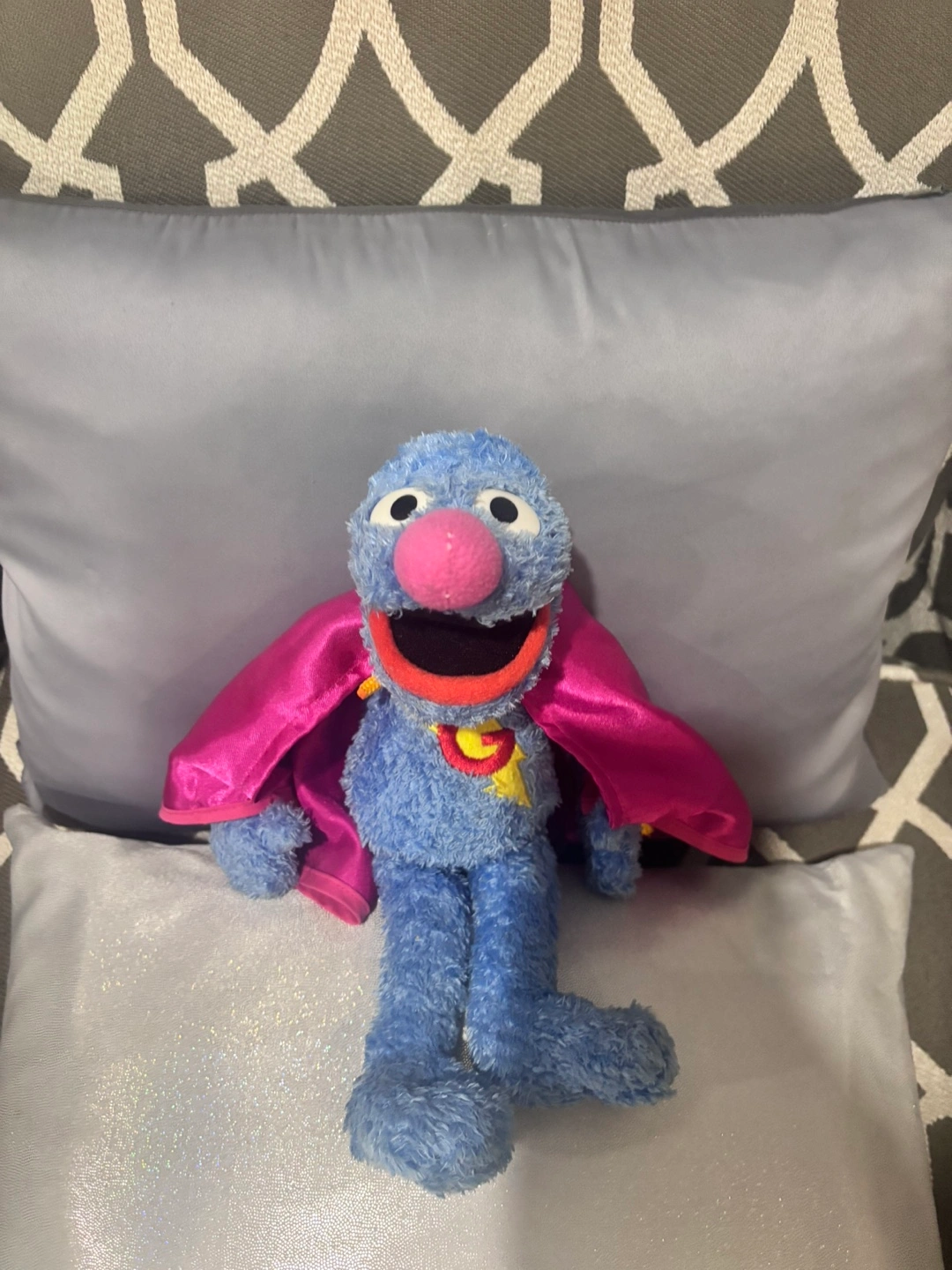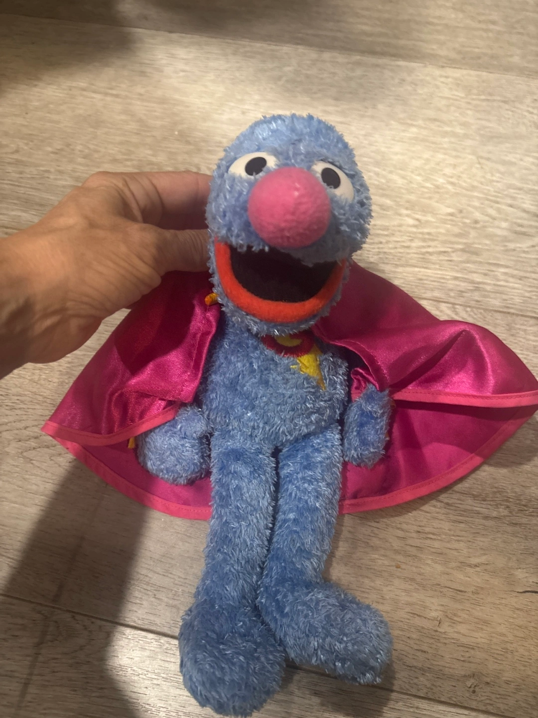Here's a Super Grover plush toy from Sesame Street! This cute blue plushie is wearing his signature red cape and has a fun, friendly face. Perfect for any Sesame Street fan or collector! Up, up, and away! This authentic Super Grover plush from Sesame Place brings back the charm of everyone’s favorite fuzzy blue superhero from Sesame Street. Featuring his signature bright pink nose, wide smile, and satin magenta cape embroidered with the yellow “G”, he’s ready to save the day—no helmet needed! This pre-owned plush is used but intact, with gentle wear from age and play. The cape remains attached and vibrant, and the body is clean and huggable. Perfect for collectors, vintage toy lovers, or anyone nostalgic for the classic Sesame Street characters. Details: • Authentic Sesame Place exclusive (official Sesame Workshop tag) • Size: approx. 12–14 inches tall • Condition: Used, missing helmet, clean and intact • Material: Soft plush polyester with satin cape • Era: 2000s release • Smoke-free home Back view: The cape is bright and shiny with no tears or stains (see photo).