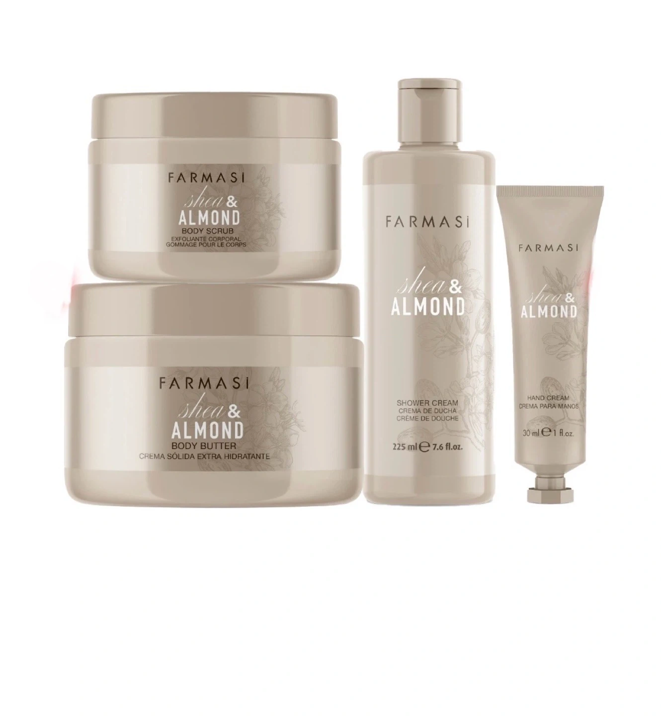 Shea & Almond care set: body scrub, body butter, shower cream, and hand cream. Deep hydration and silky smooth skin. / Set de cuidado corporal con karité y almendra: exfoliante, body butter, crema de ducha y crema de manos. Hidratación profunda y piel suave con aroma delicado.