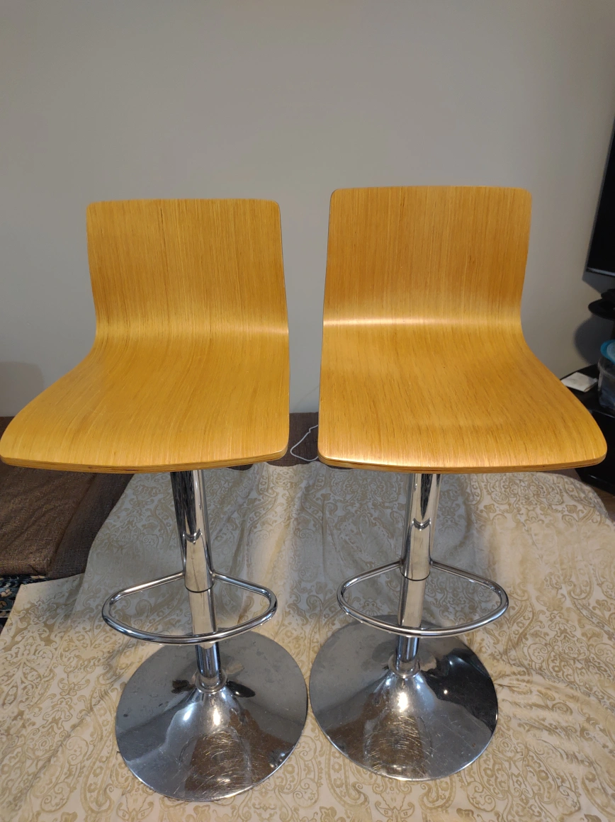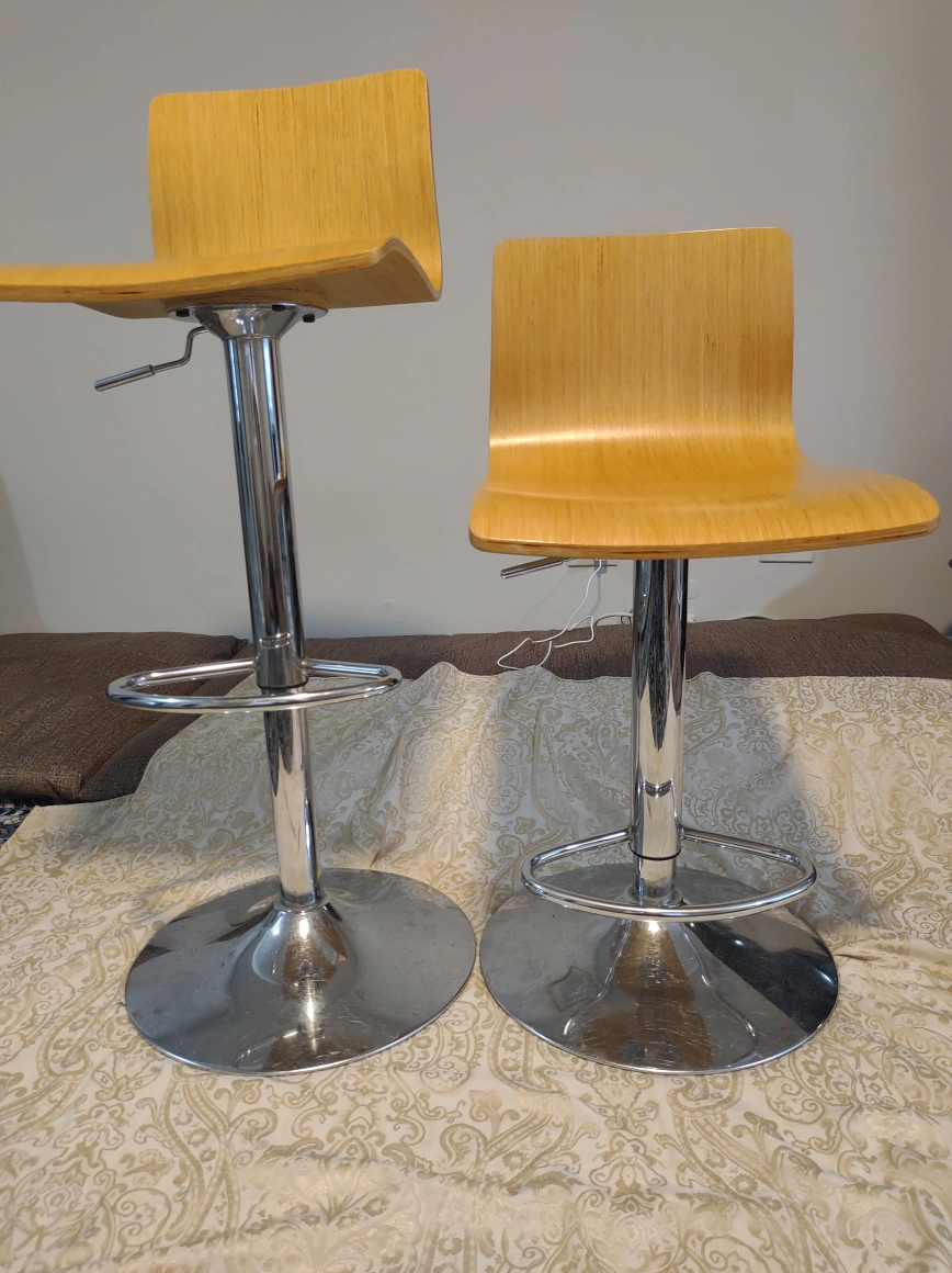 44Selling a set of two bar stools with adjustable height. They feature a light wood seat and a chrome base. These stools are perfect for a kitchen island or bar area!