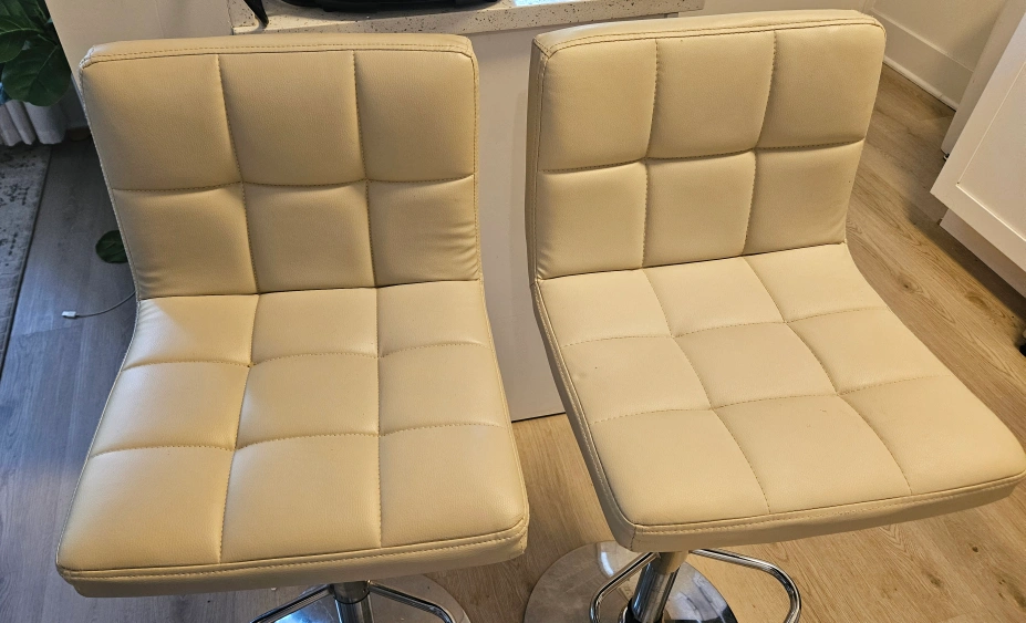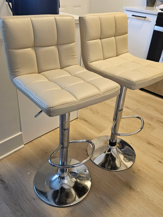 10Selling a set of two adjustable swivel bar chairs. They are in great condition and would look great in any kitchen or bar area. The stools are beige and have a square quilted pattern on the seat and back. They feature a chrome base and footrest for added comfort