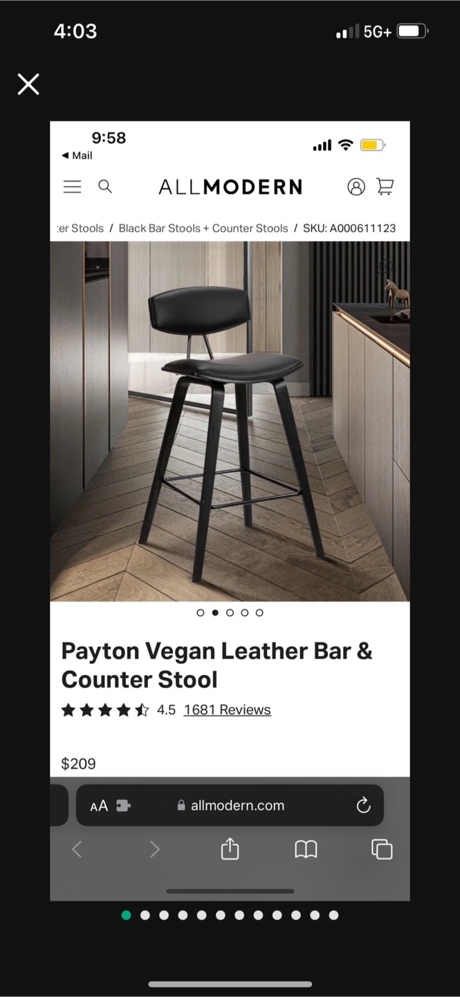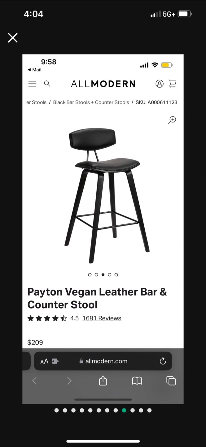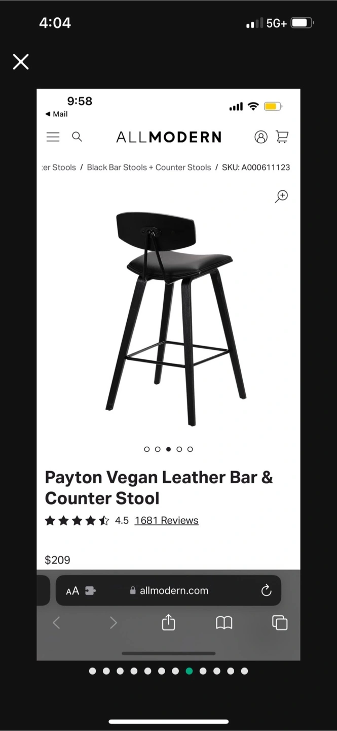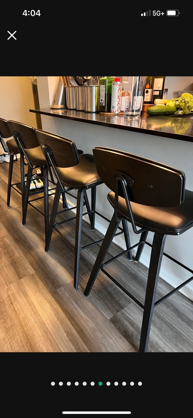 Selling a gently used Set of 2 AllModern Payton Vegan Leather Counter Stool. This stylish stool is perfect for your kitchen or bar area. It features a sleek black design and comfortable vegan leather seat. Originally bought for 200/each.