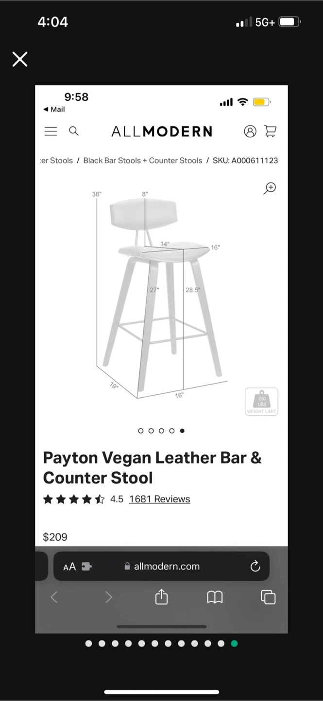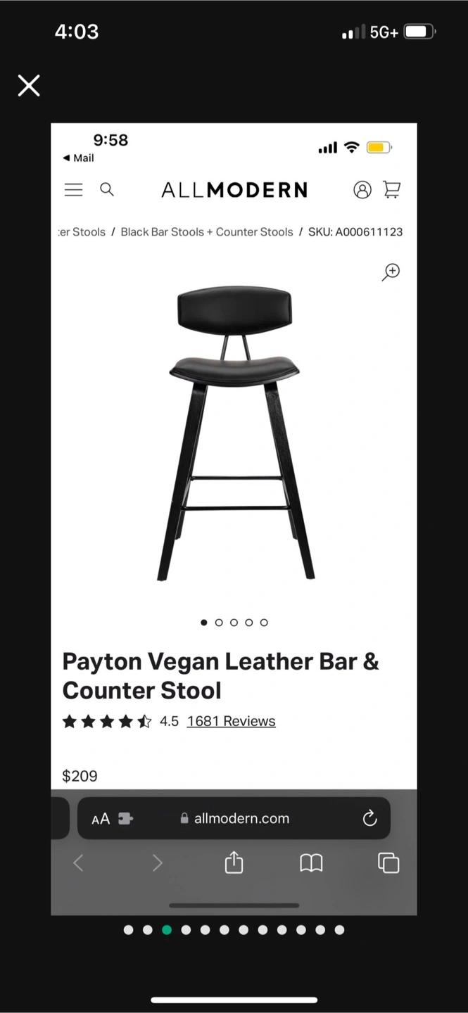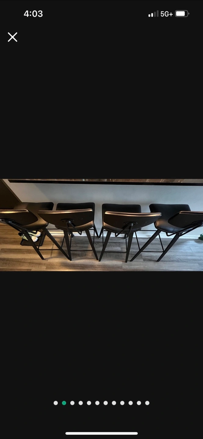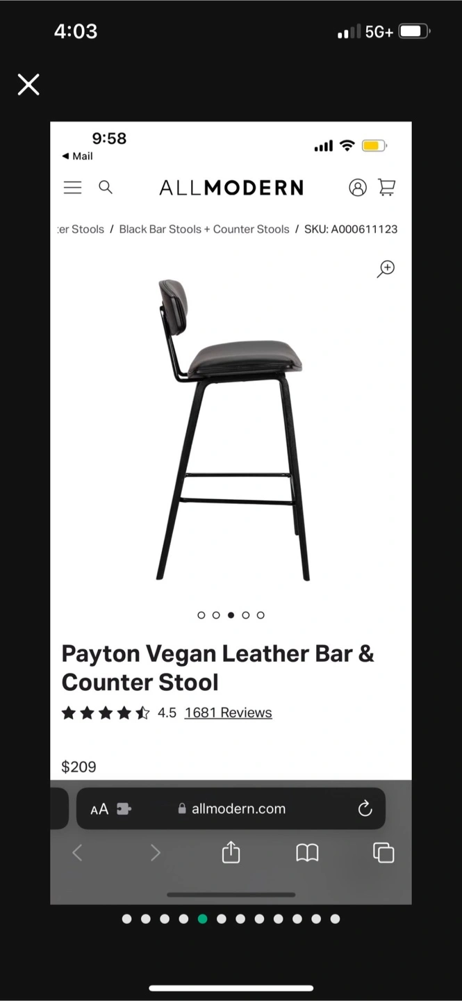 Selling a gently used Set of 2 AllModern Payton Vegan Leather Counter Stool. This stylish stool is perfect for your kitchen or bar area. It features a sleek black design and comfortable vegan leather seat. Originally bought for 200/each.