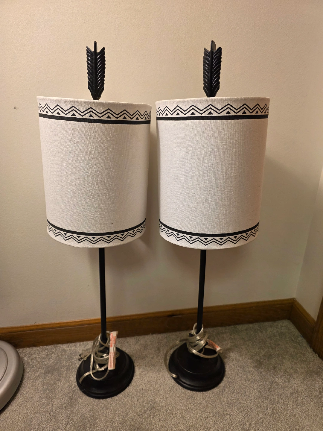 60Selling a set of two stylish arrow table lamps! They feature a unique arrow design on top and a patterned lampshade. These lamps are perfect for adding a touch of modern flair to any room Pick up in Naperville near naper blvd and 87th street or near downtown Naperville off of Chicago and Charles