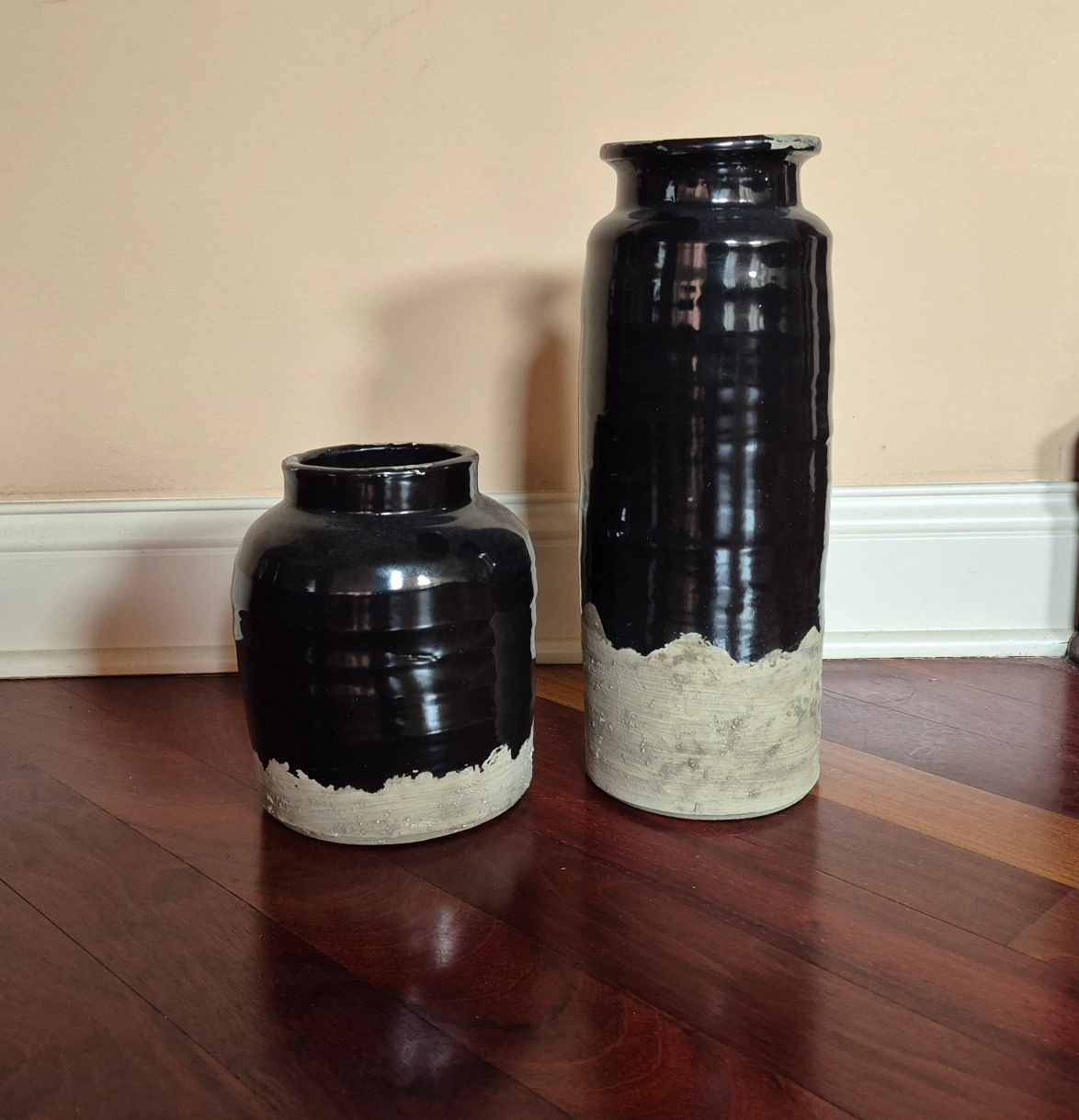 Two ceramic vases. Black glossy top with a grey base. Different sizes. Modern style. Perfect for home decor.