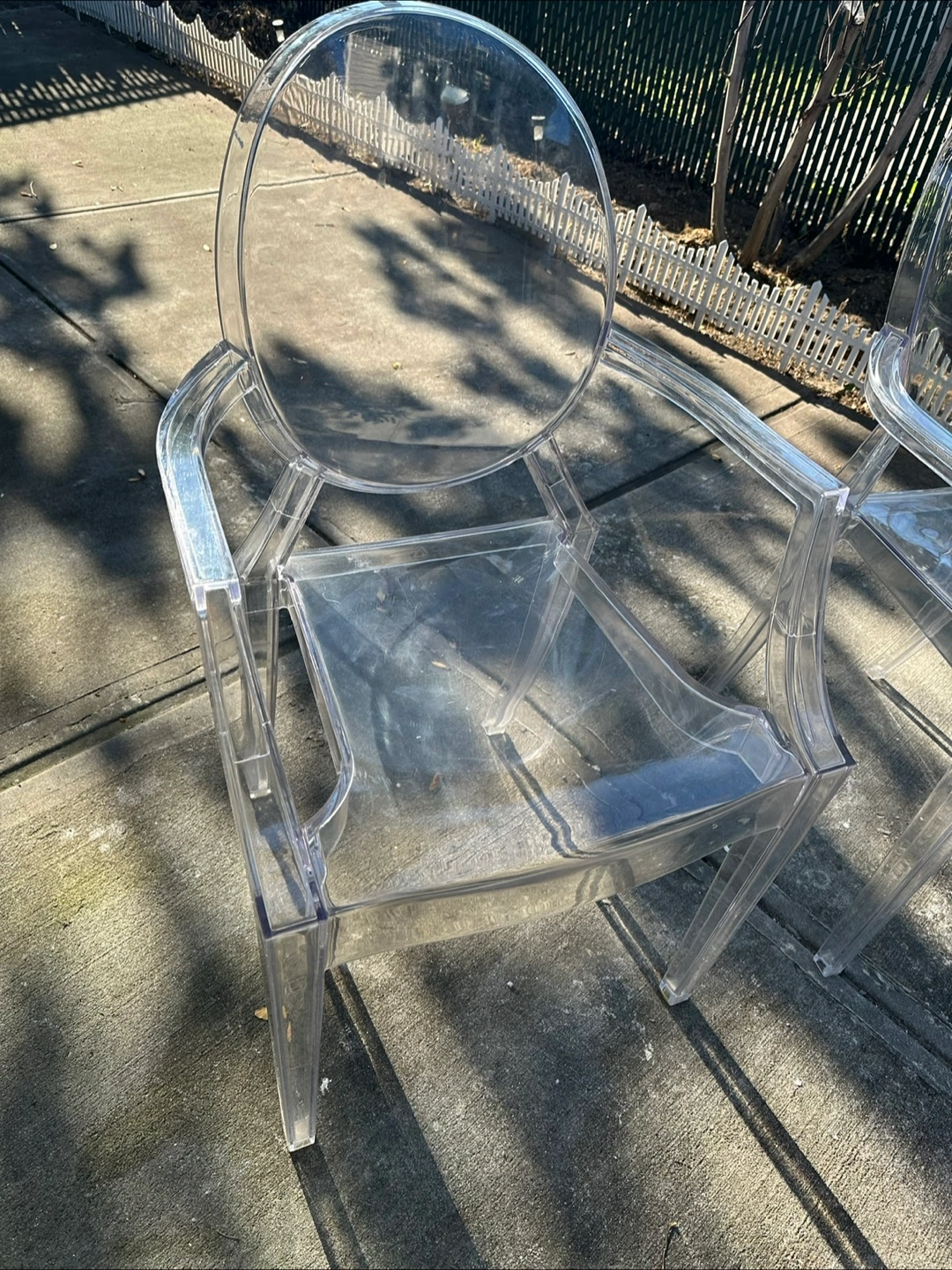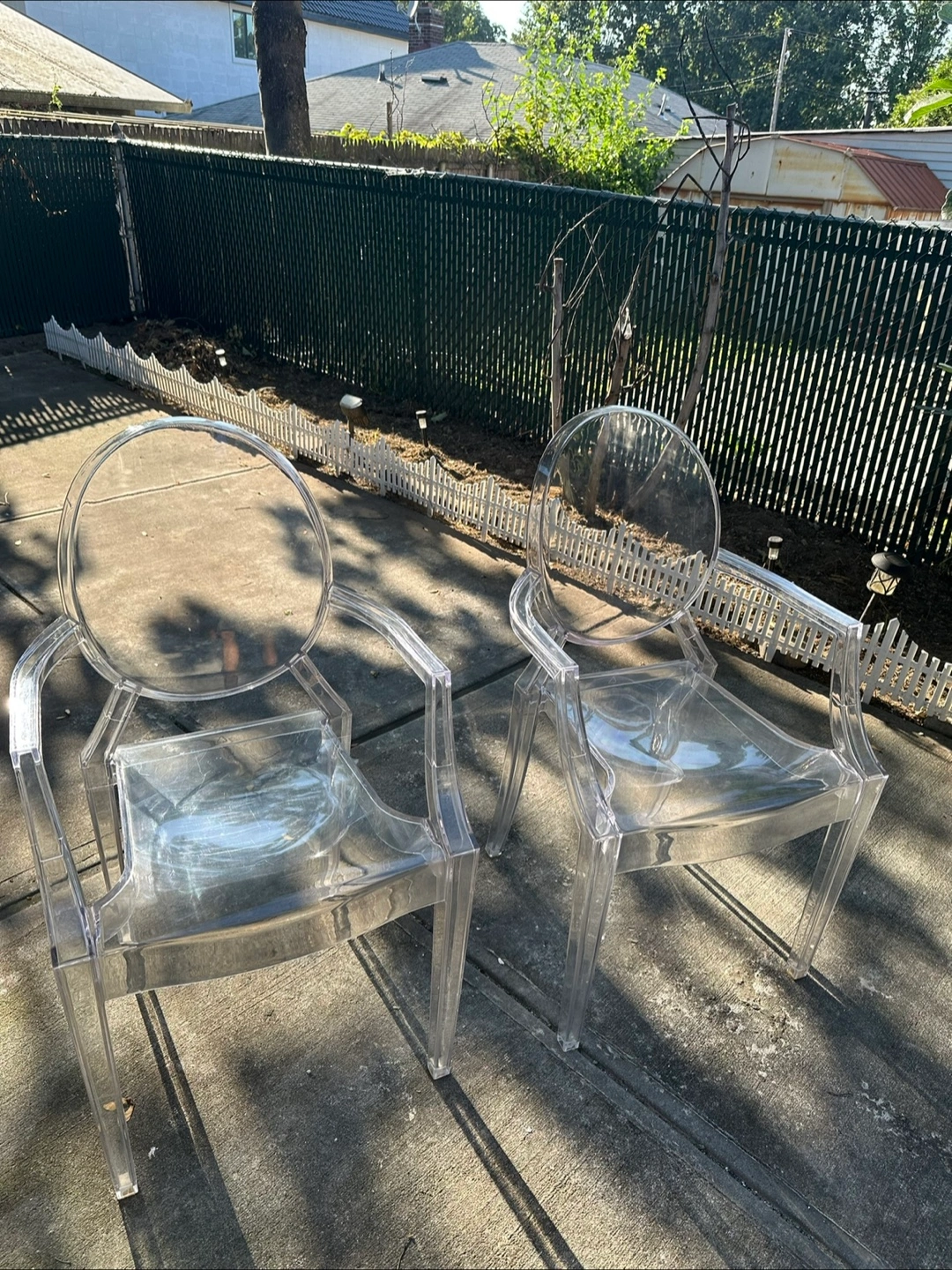 Selling a set of two clear acrylic dining chairs! These chairs are in good condition and would be a stylish addition to any dining space. They're made of acrylic, which is durable and easy to clean