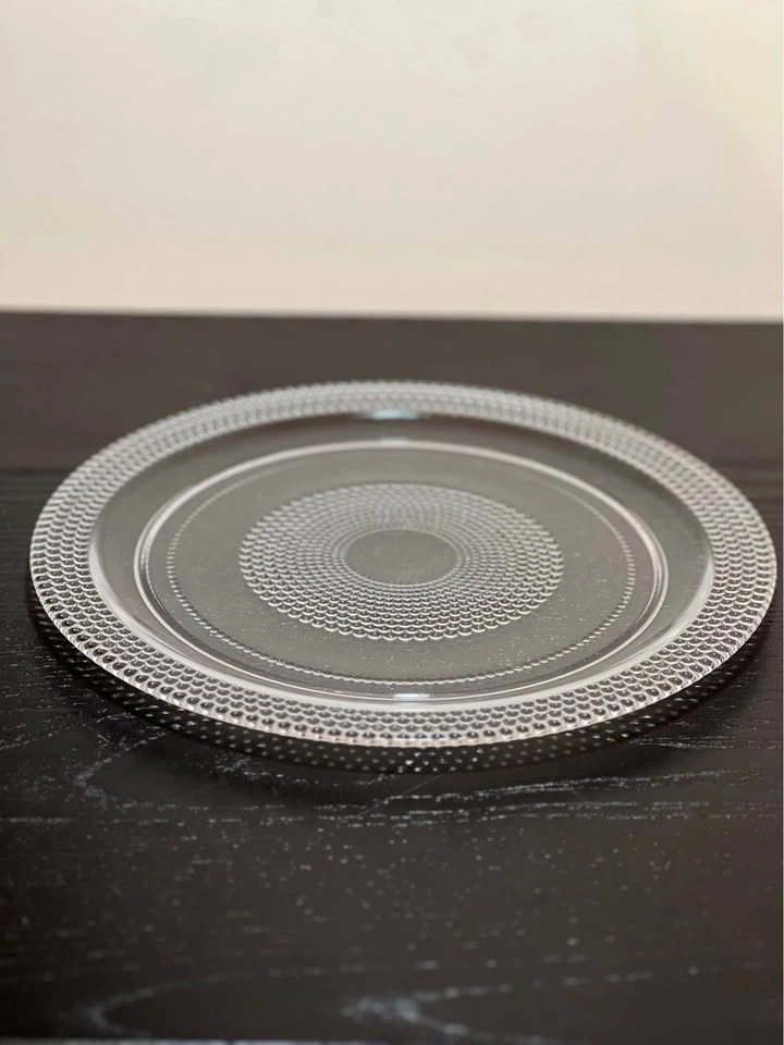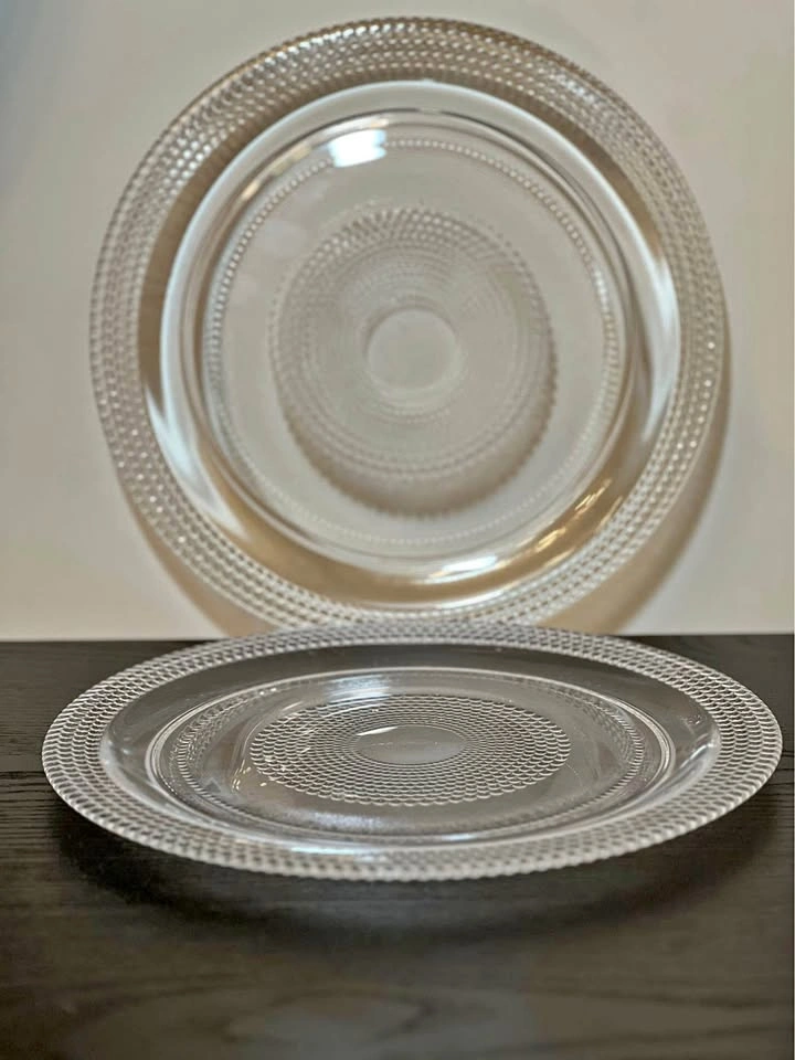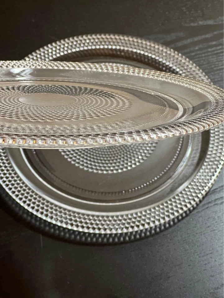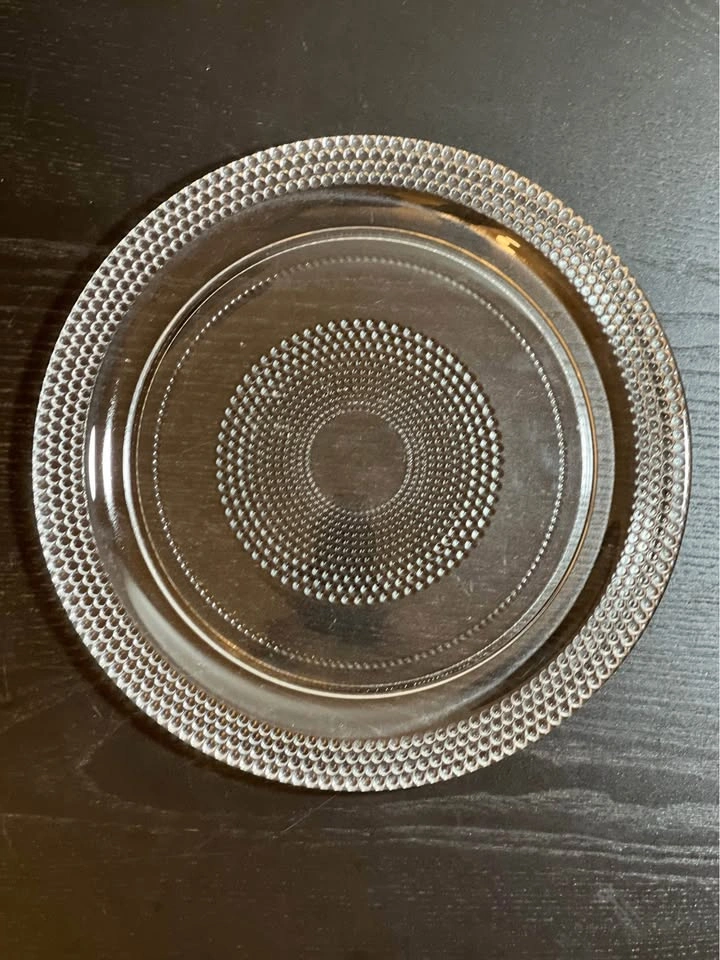 98This set of 2 glass plates are the Colette pattern by Crate & Barrel. The pattern features a clear glass plate with a beaded border and a dotted spiral design in the center. This pattern was discontinued between 2006 and 2008. Crafted in Turkey