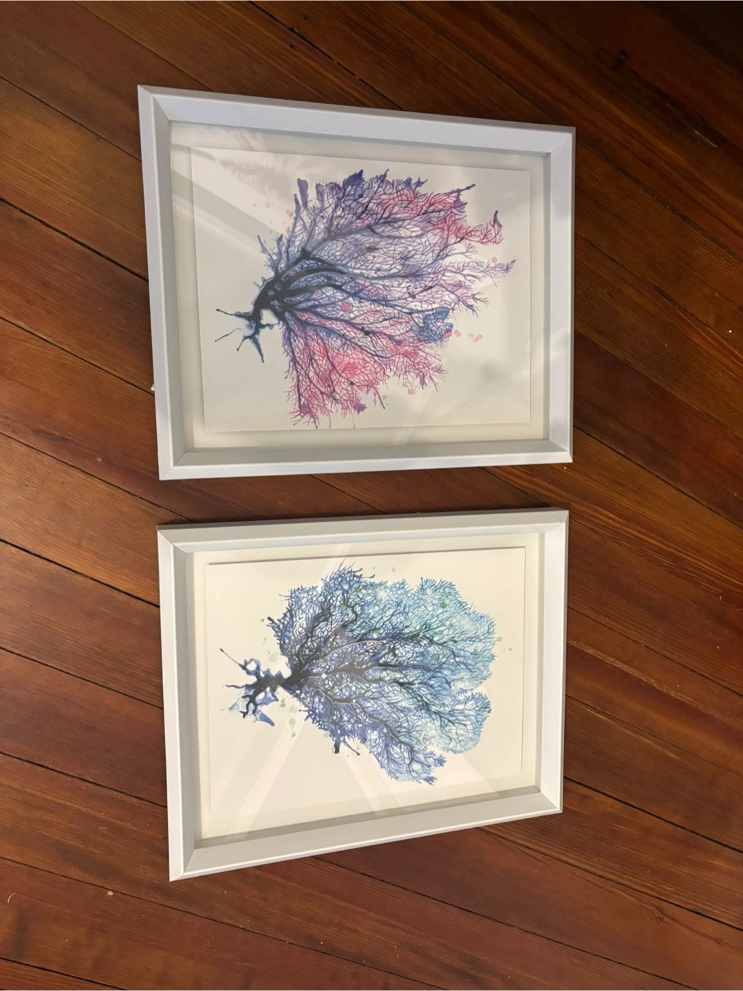 Selling a set of two framed coral prints. They feature a unique design and add a touch of elegance to any room. One is a beautiful mix of pink and blue, while the other is a cool blend of blue and green. Perfect for adding a pop of color to your walls!