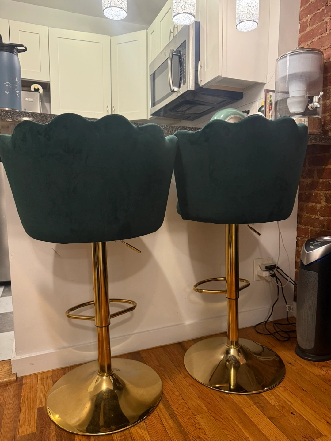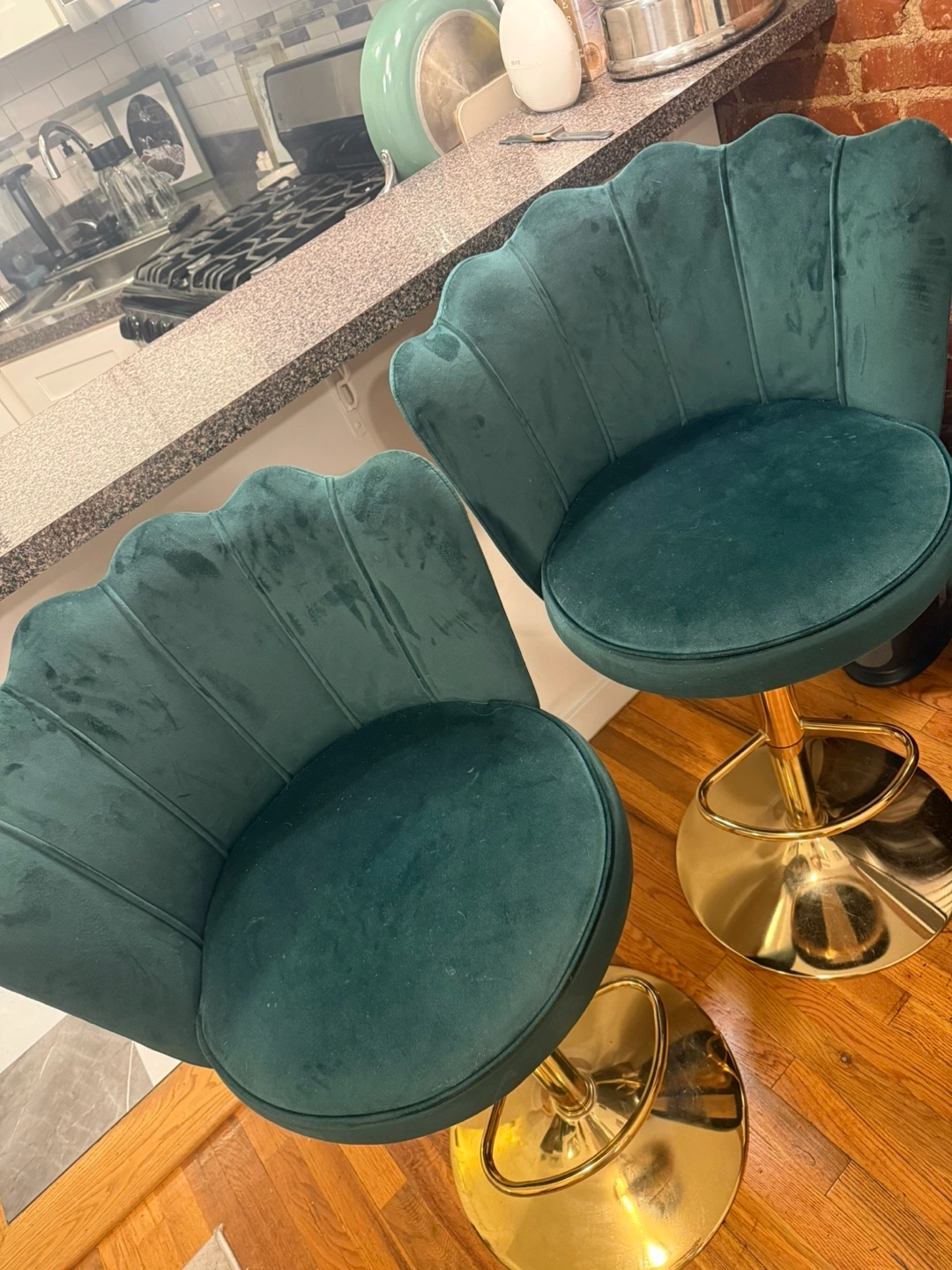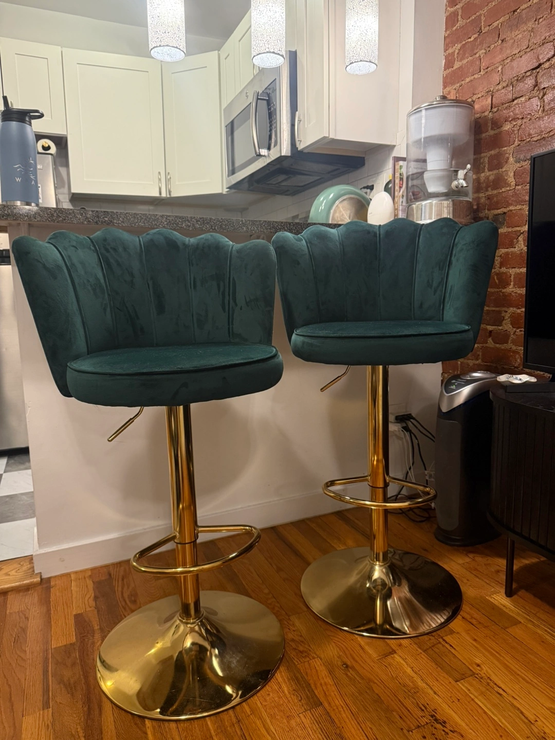 65Selling a set of two stylish bar stools! They feature a beautiful green velvet upholstery and a gold-tone base. These stools would add a touch of elegance to any kitchen or bar area and are adjustable in height. Like new!