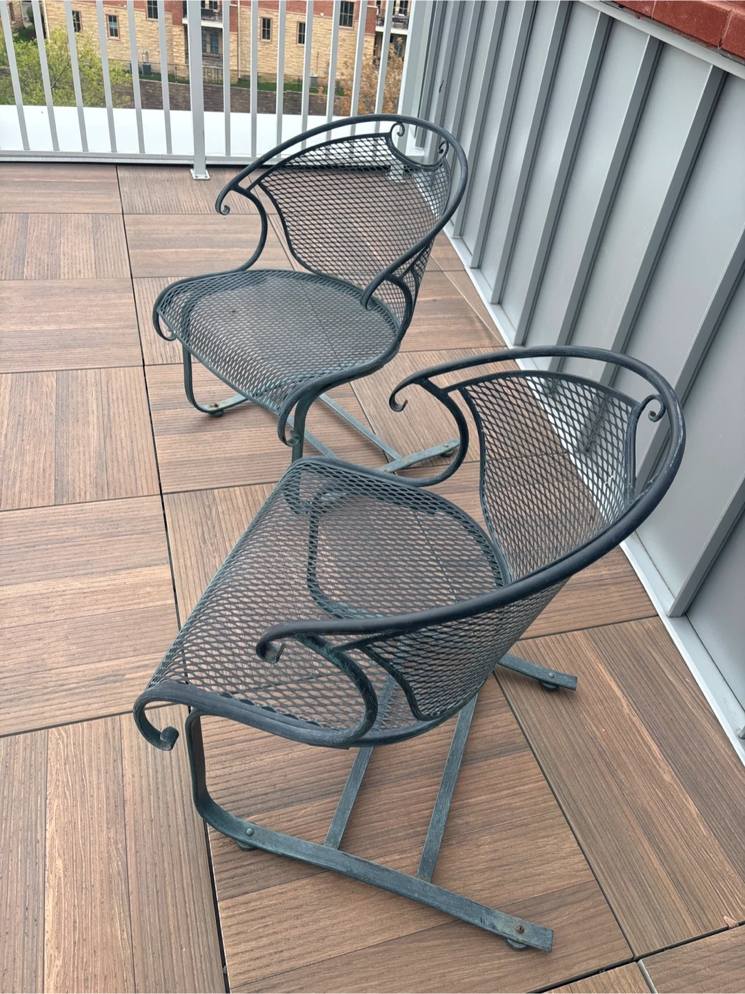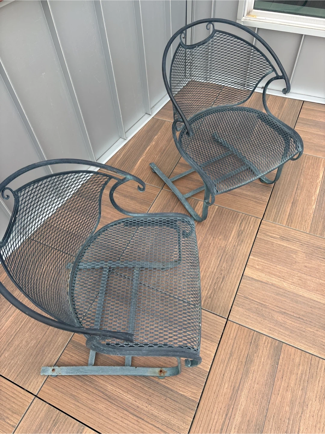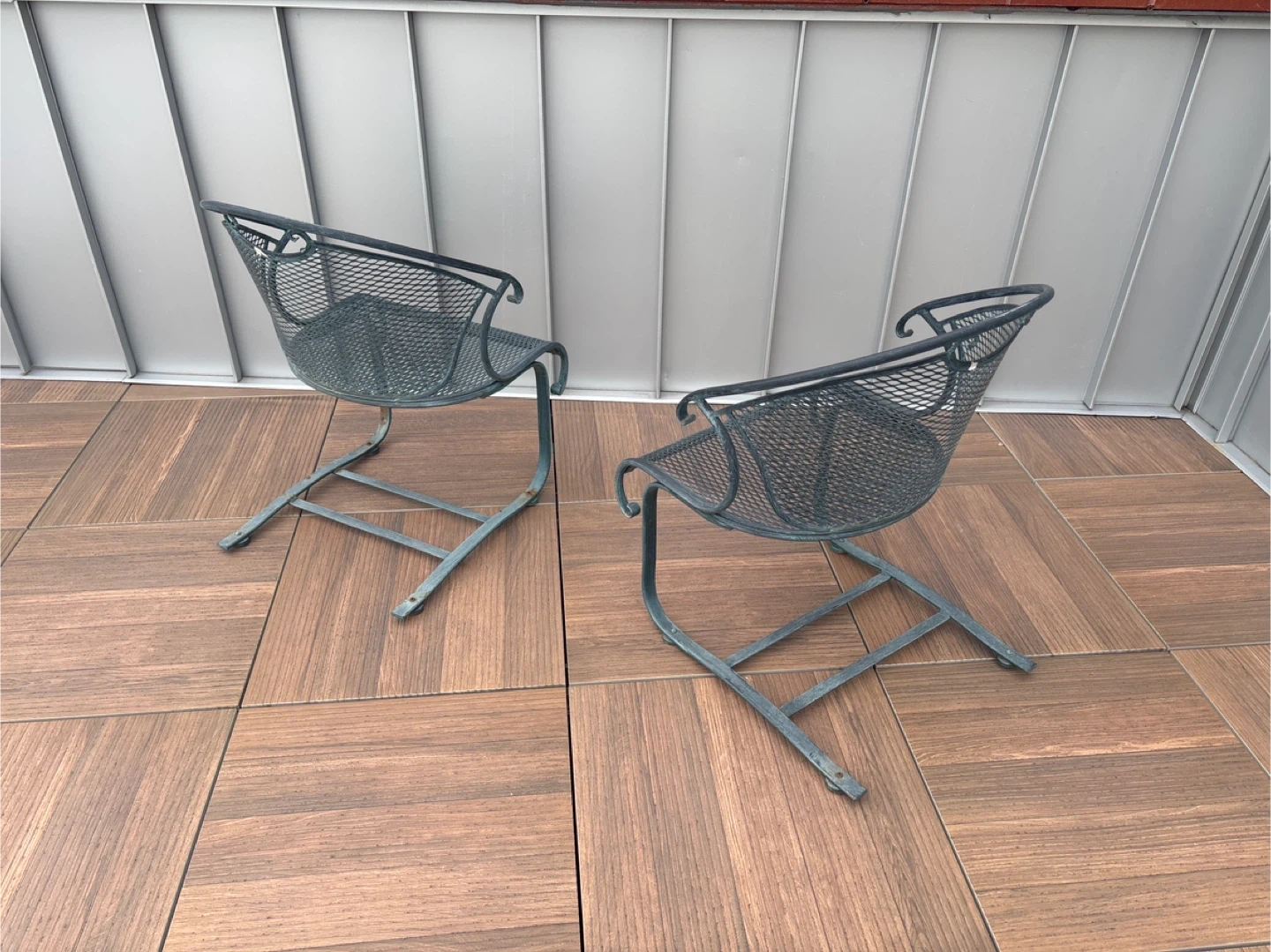 Selling a set of two metal outdoor chairs. They have a classic design and are perfect for your patio or garden. They're sturdy and comfortable for relaxing outdoors