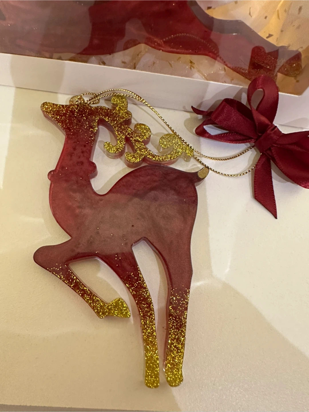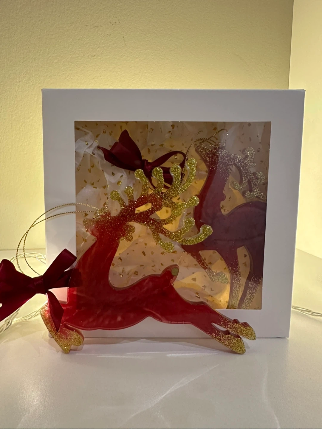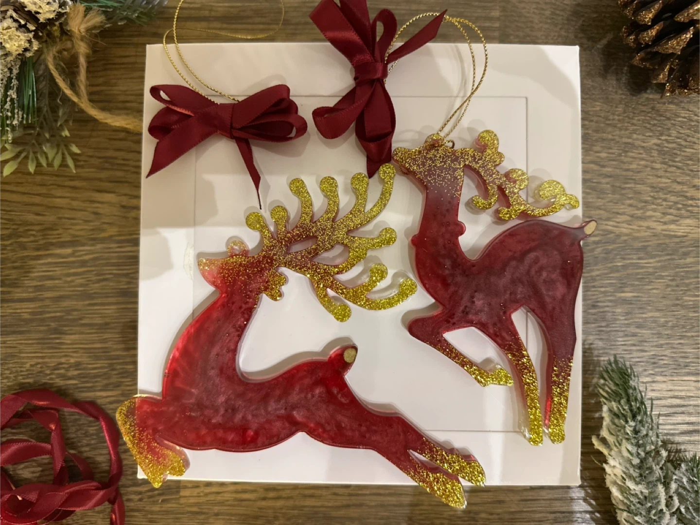 Add a touch of holiday magic to your Christmas tree with this handmade set of two resin ornaments. 🎅✨ • Design: Red reindeer with golden glitter details and ribbon accents • Material: High-quality epoxy resin, lightweight & durable • Packaging: Comes in a festive white gift box with clear window – perfect for gifting or storing • Condition: Brand new, handmade with care 🎁 Great as a holiday gift or as a special addition to your own Christmas décor. 📸 Please see photos for details.