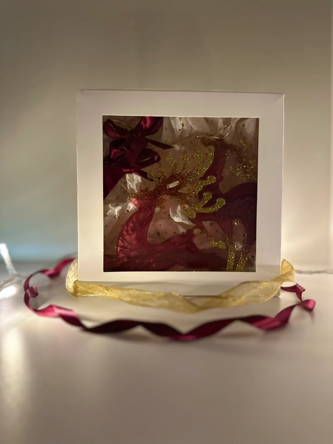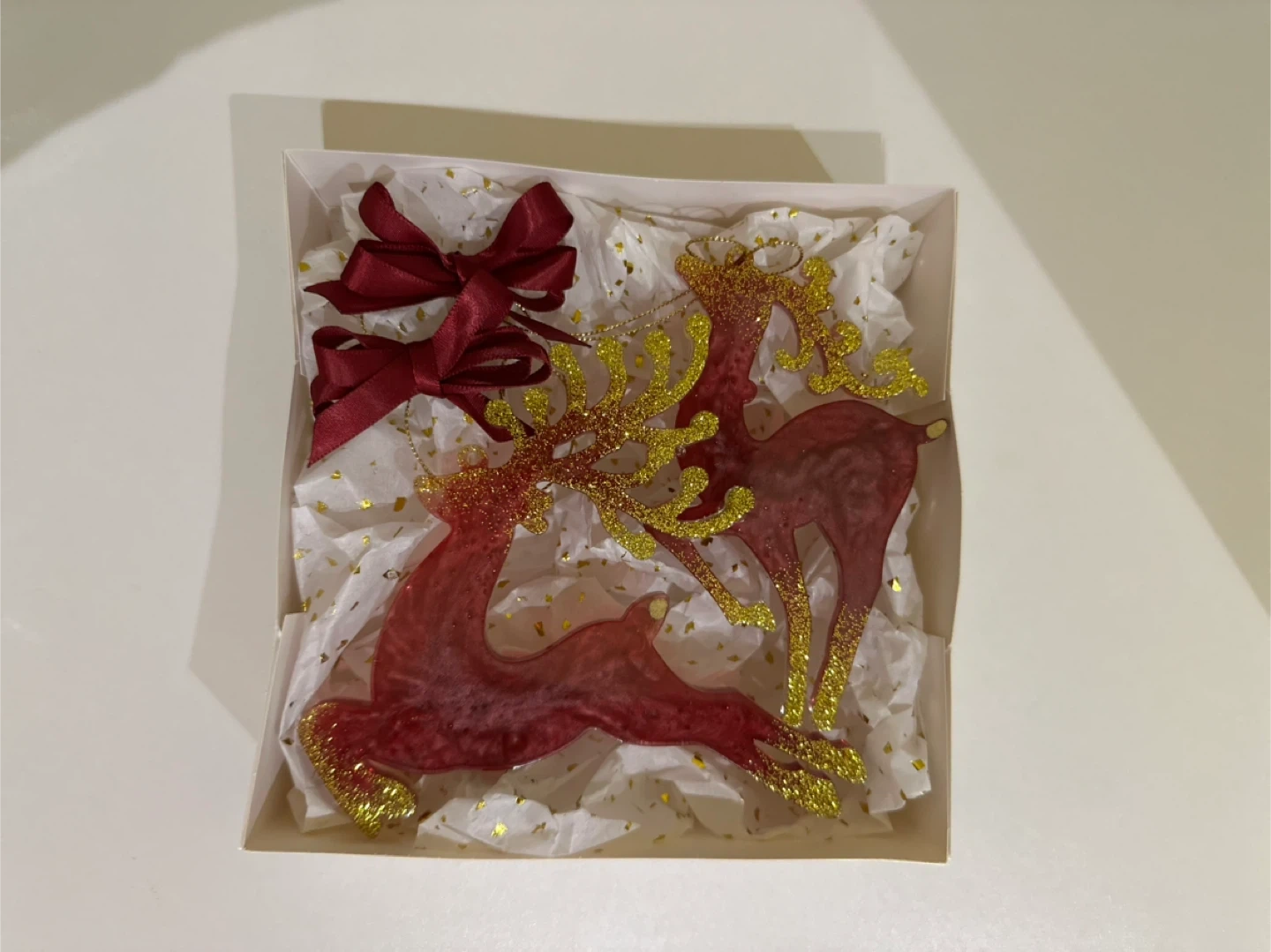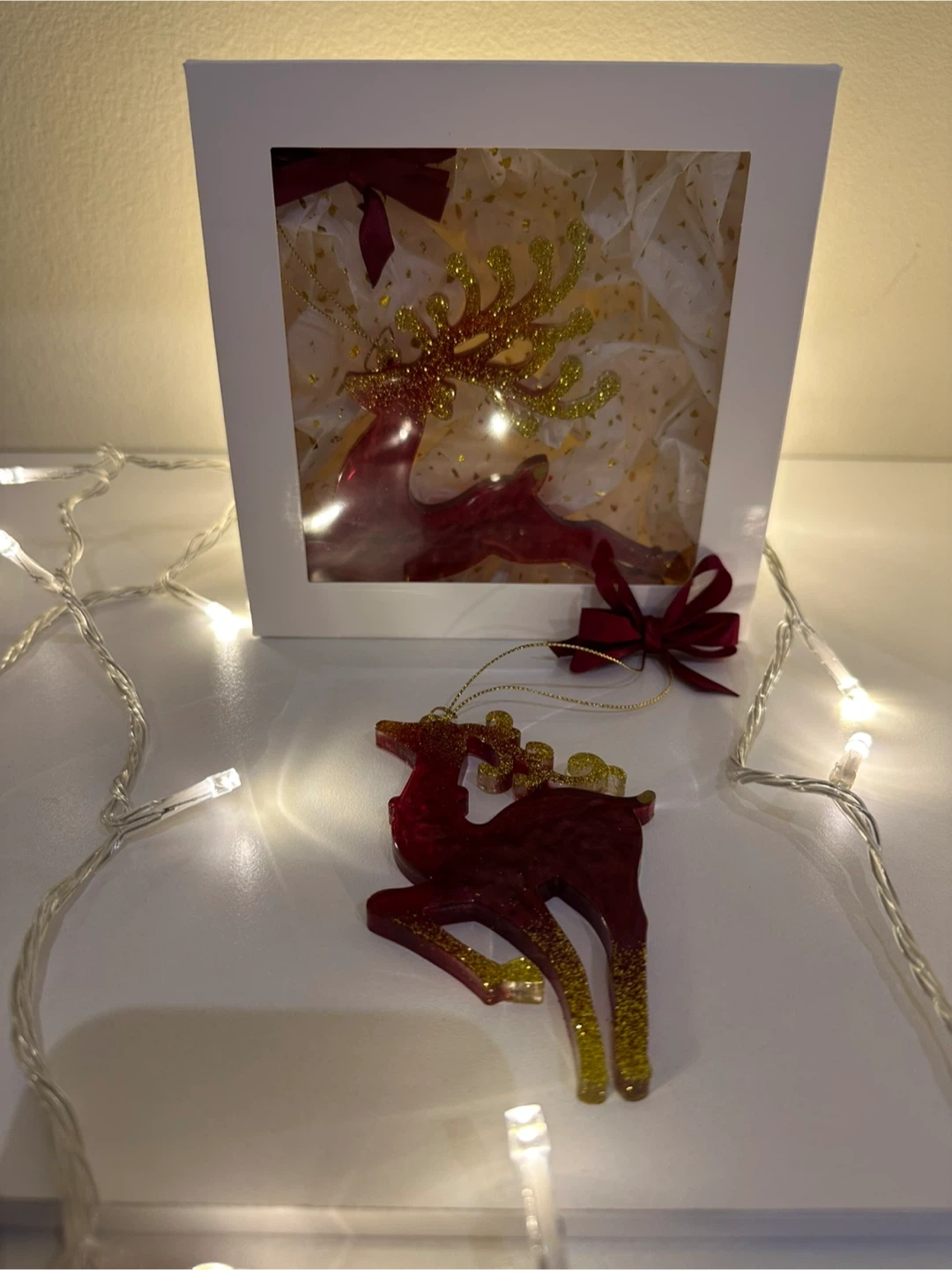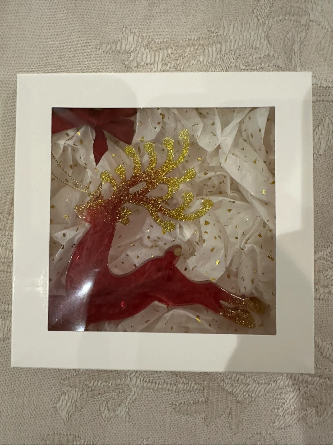 Add a touch of holiday magic to your Christmas tree with this handmade set of two resin ornaments. 🎅✨ • Design: Red reindeer with golden glitter details and ribbon accents • Material: High-quality epoxy resin, lightweight & durable • Packaging: Comes in a festive white gift box with clear window – perfect for gifting or storing • Condition: Brand new, handmade with care 🎁 Great as a holiday gift or as a special addition to your own Christmas décor. 📸 Please see photos for details.