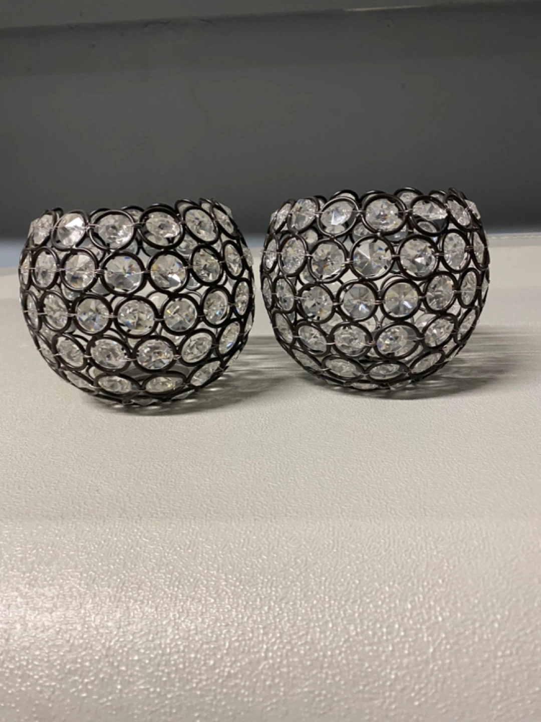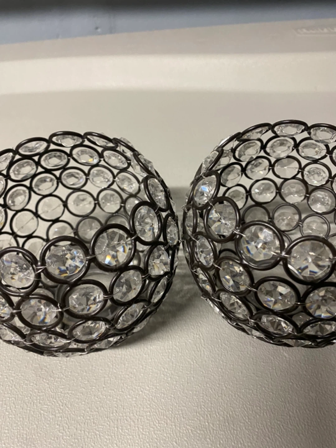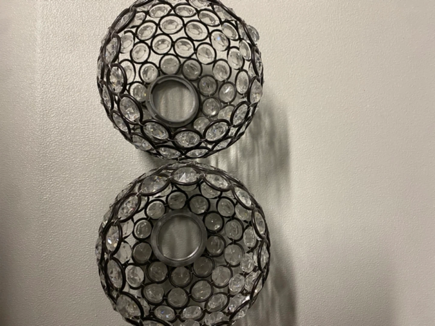 10Selling a set of two decorative sconces holders! They feature a spherical design with a metal frame and clear crystal accents. These sconces holders are perfect for adding a touch of elegance to any room