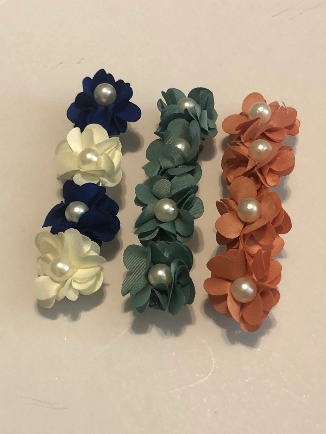 23Three pretty hair clips. Each clip features three fabric flowers with pearl centers. Colors include cream, teal, and coral. Perfect for adding a touch of elegance to any hairstyle.