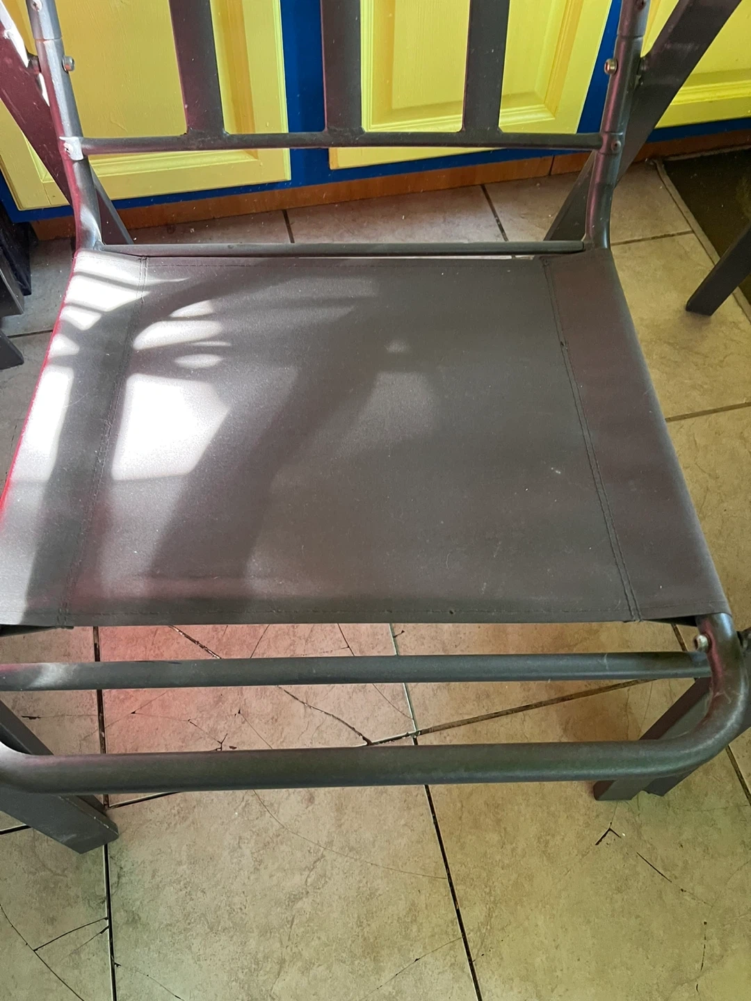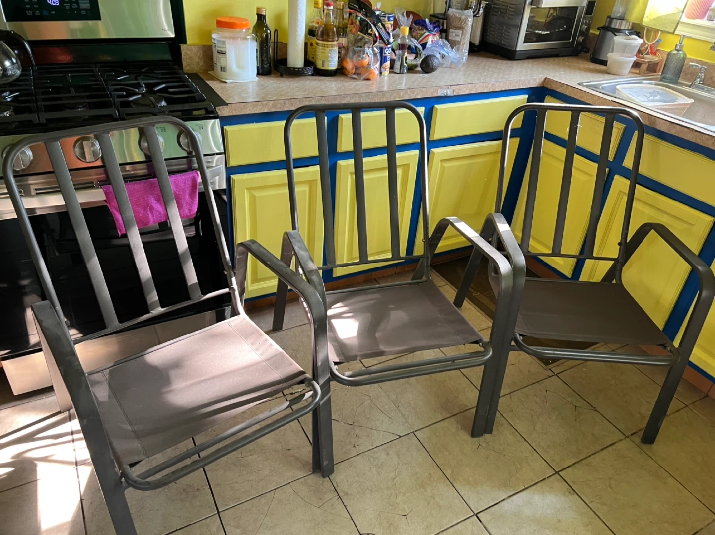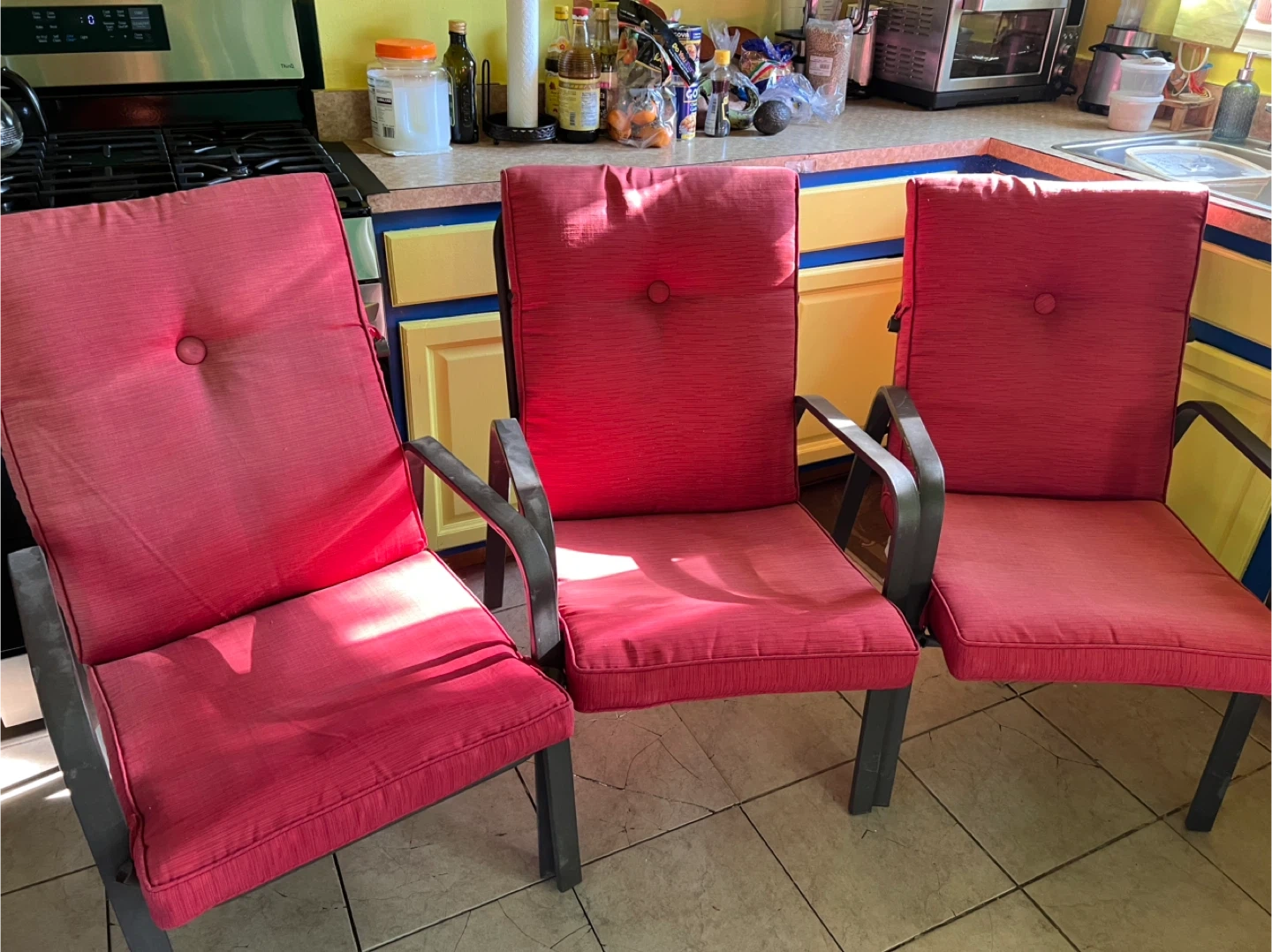 Selling a set of three outdoor patio chairs. They are red with a button design on the back and seat cushions. The frames are dark gray. They are in good condition and ready for your patio or deck Condition: - sun bleaching on the back fabric of seat pads - scuff marks on the metals frame