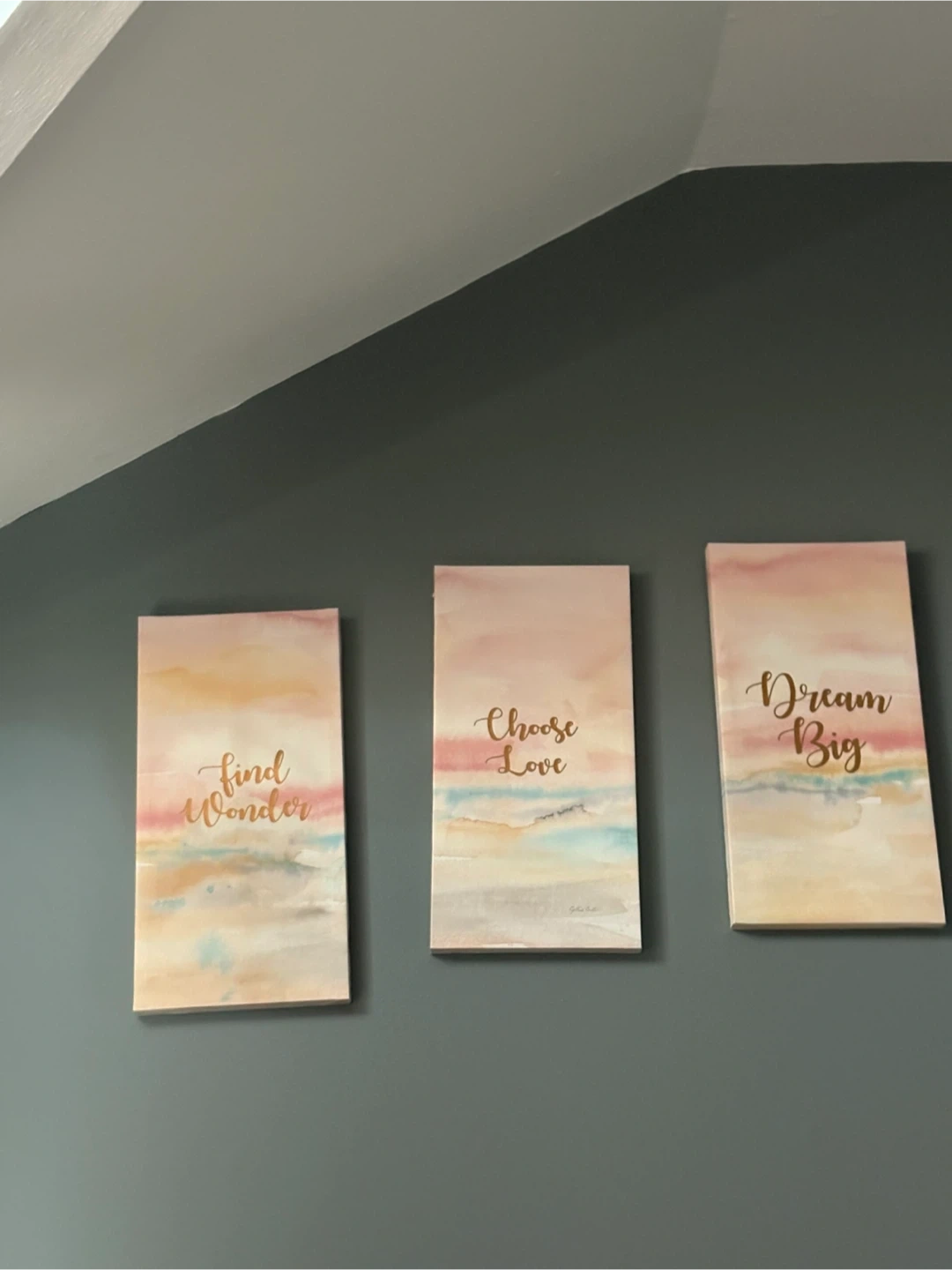 Selling a set of 3 wall art canvases. Each canvas has a different inspirational phrase: Find Wonder, Choose Love, and Dream Big. They feature a watercolor background in soft pastel colors. Perfect for adding a touch of inspiration to any room