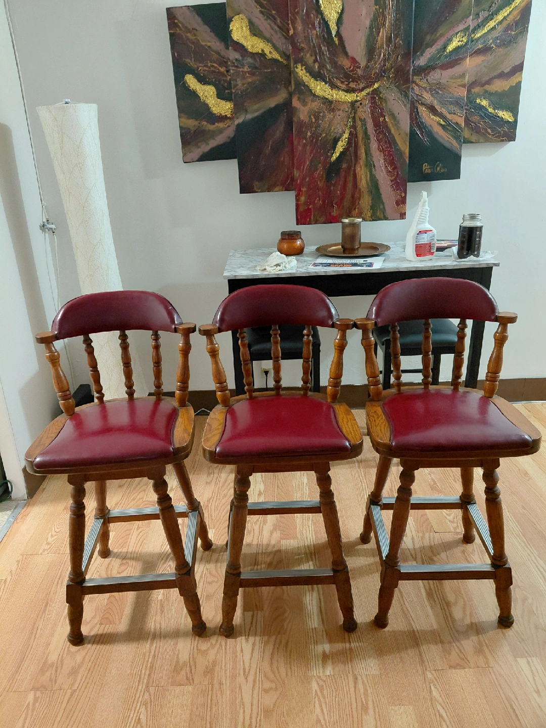 65Selling a set of three wooden bar stools! They feature a classic design with a sturdy wooden frame and comfortable red seats. Great for adding a touch of vintage charm to your kitchen or bar area