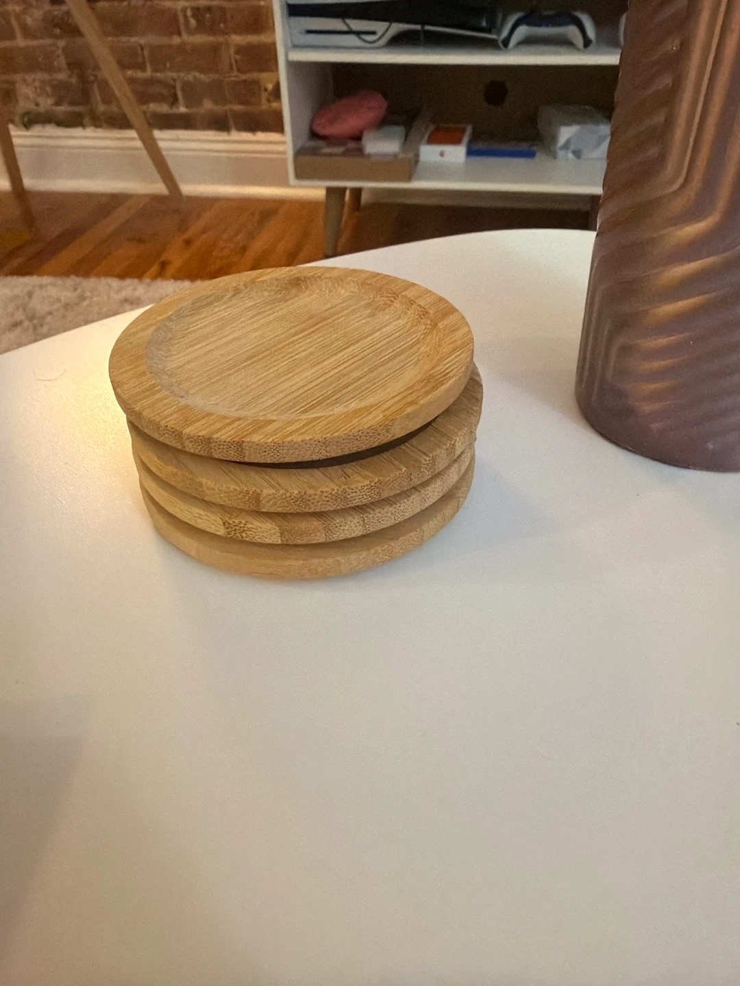 15Selling a set of four bamboo coasters. They're perfect for protecting your furniture from water rings and adding a touch of natural style to your home. They are in great condition and ready to use!