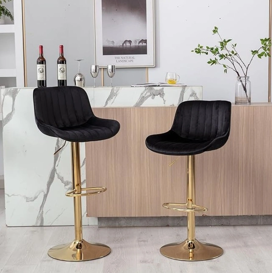 Selling a set of 4 bar stools. They feature a sleek black velvet seat and a shiny gold base. Perfect for adding a touch of elegance to your kitchen or bar area! Seller's Notes:Plush hydrolic chairs. These black chairs lift and lower with hydrolics making them adjustable for many table heights. They are currently being used for bar height tables. They are in brand new condition. Stain free, blemishes free, smoke free, pet free home. Pied-à-terre. Never used! Price negotiable. Height adjustment and rotation function: There is a control lever under the seat of this bar stool. You can easily adjust the height of the seat with a slight lift, making it convenient for different people to use. At the same time, the base design can be rotated 360°, allowing you to move freely in the space and adjust the direction at will, making the use of the bar stool more convenient and flexible.