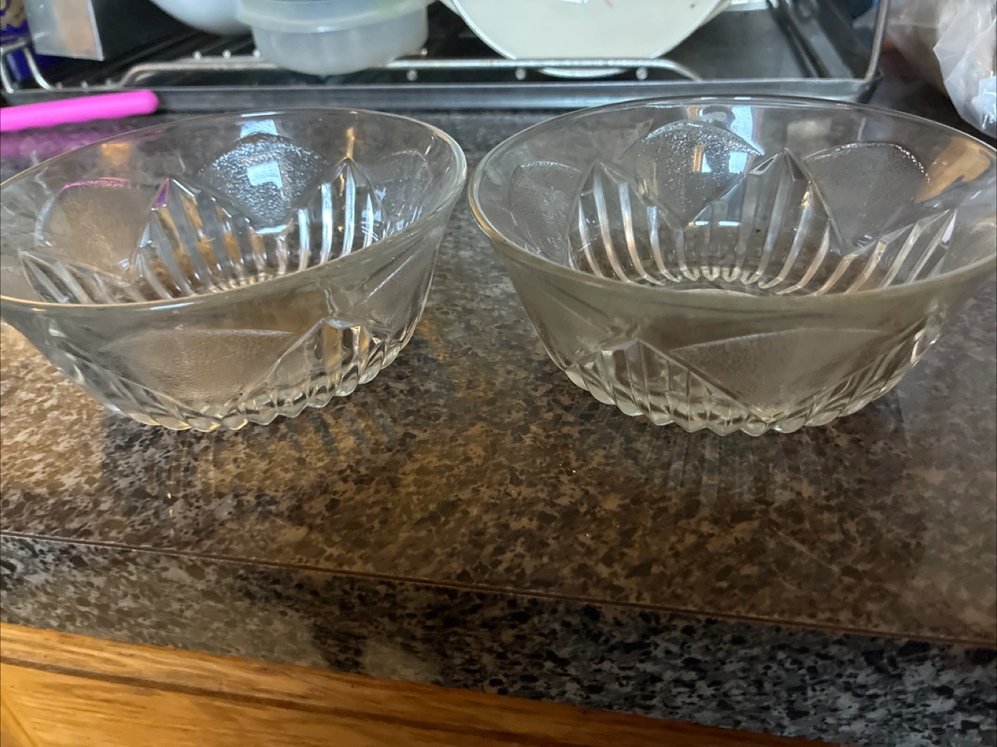 a set of two clear glass bowls. They have a lovely decorative pattern around the outside. Perfect for snacks, desserts, or small servings!