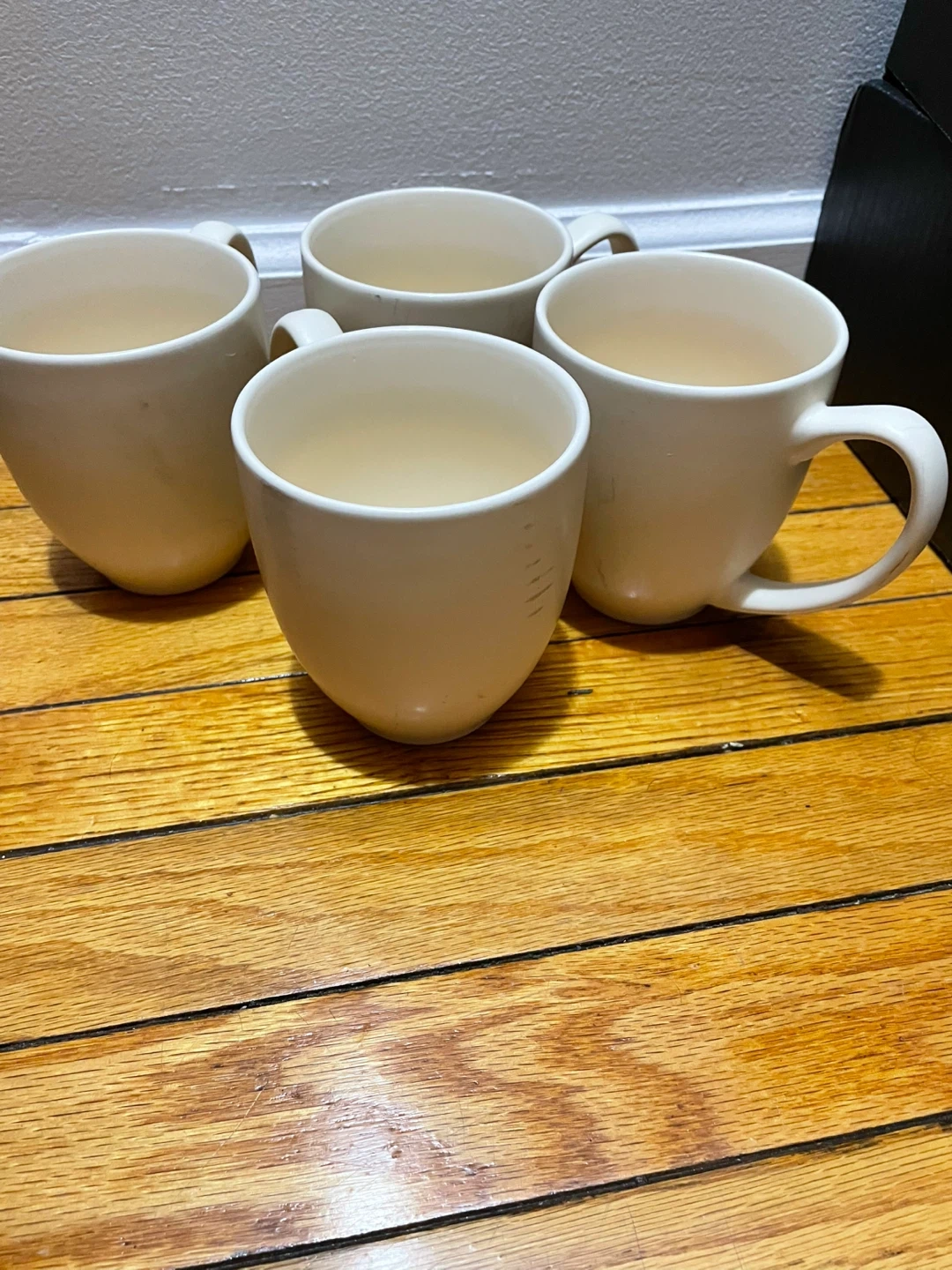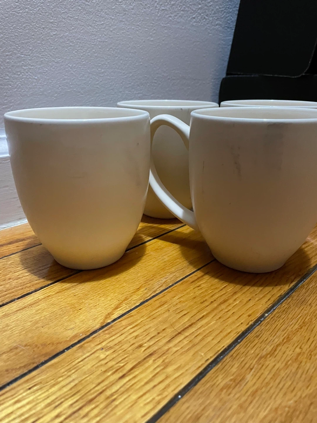 73Selling a set of four cream-colored mugs. They're in good condition and ready for a new home! Perfect for coffee, tea, or any beverage you enjoy