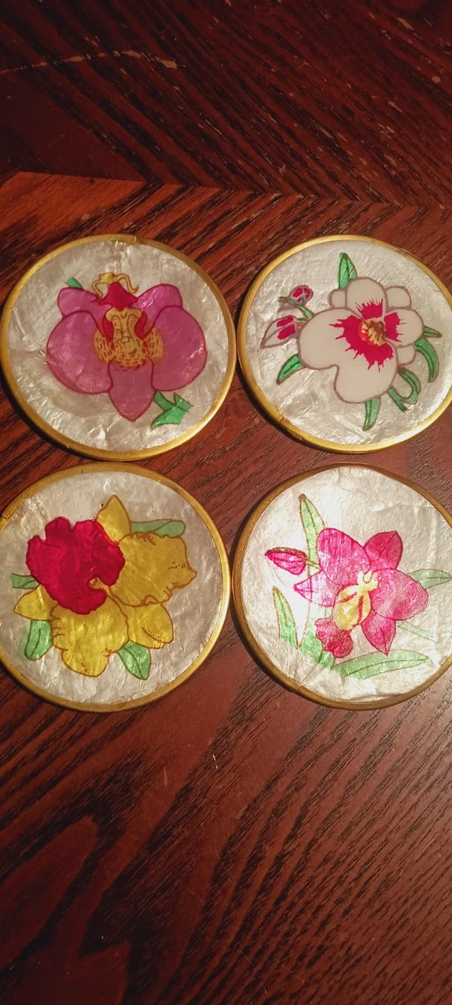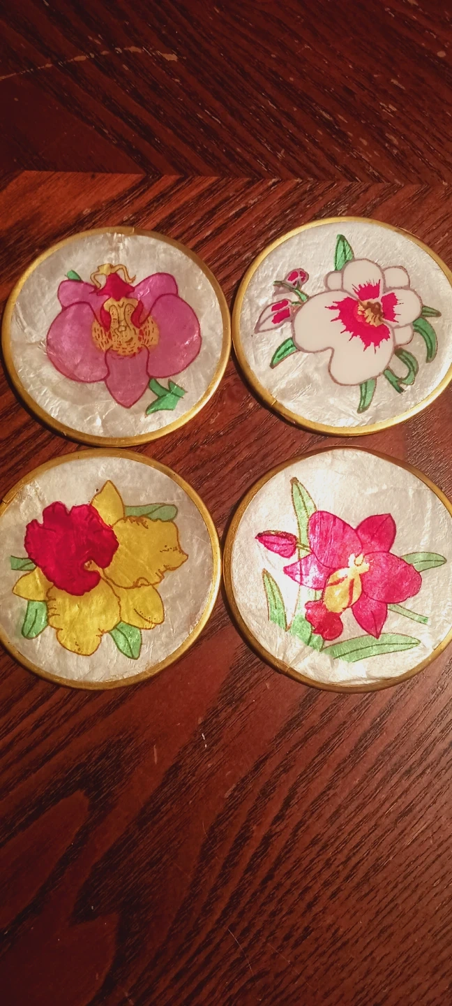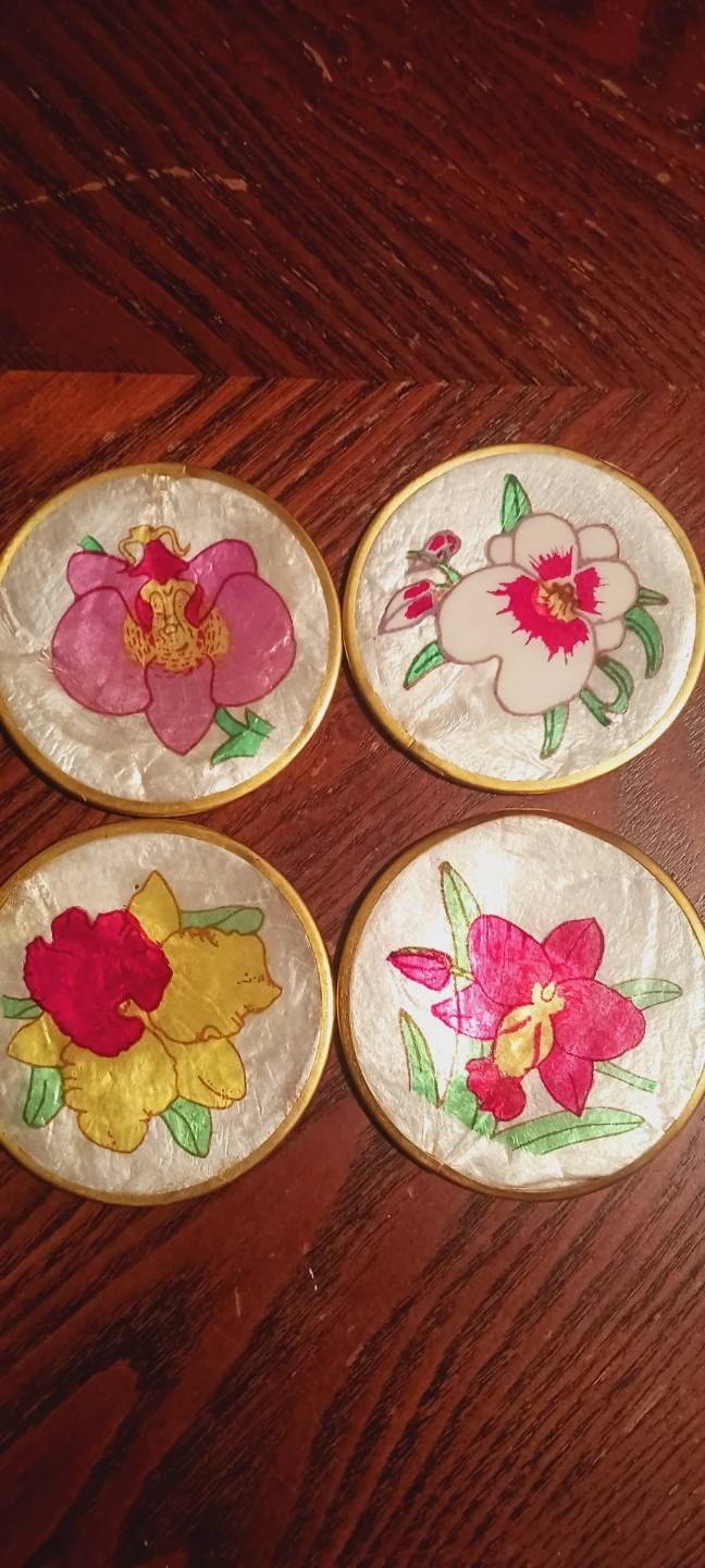 1000+NEW !! Beautiful Set of 4× Handcrafted in Philippines Coasters.Here's a set of four coasters, each with a different floral design. They have a pearlescent background and a golden rim. Perfect for adding a touch of nature to your coffee table. Handmade in Philippines. New !! Never been used. 3" diameter. ALL MY PRICES ARE NEGOTIABLE !!