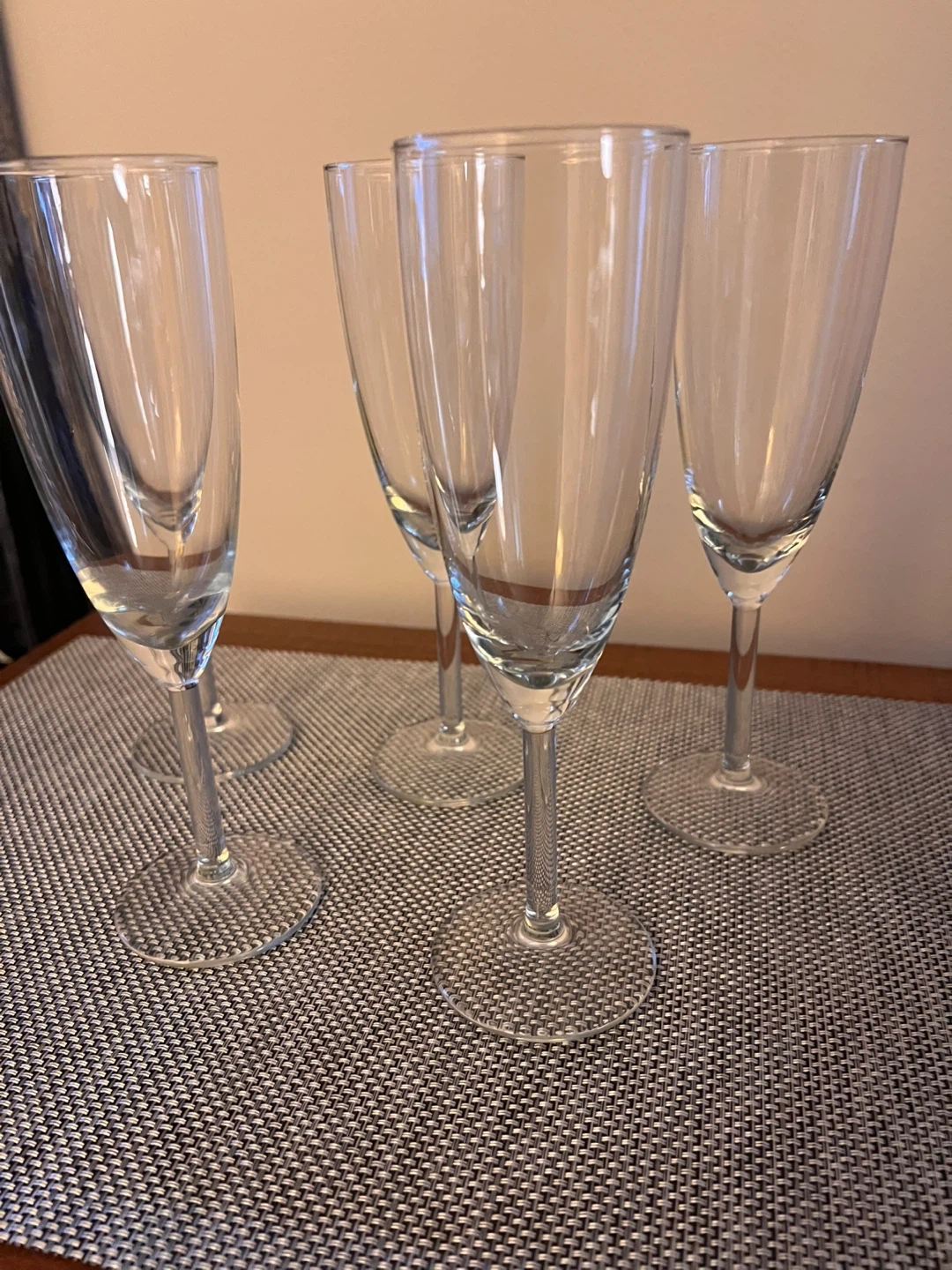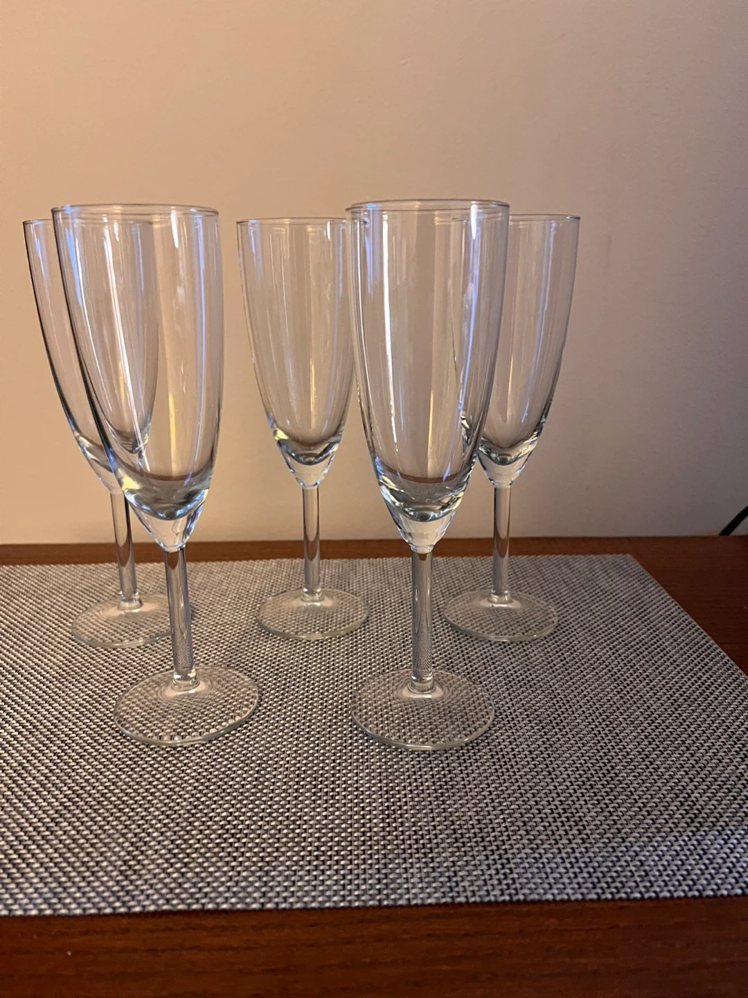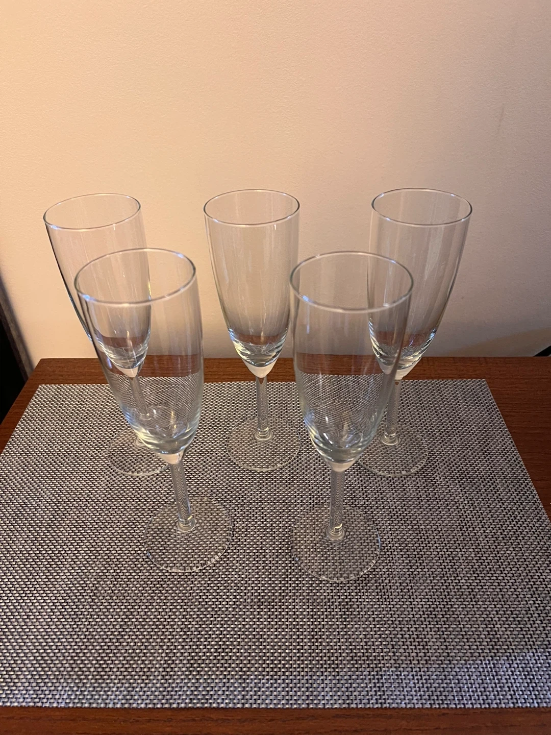 In like-new condition! Merging 2 apartments and have too much glassware. Retails for $40+tax. Set of 5 very gently used 8 oz champagne - no chips or scratches! Dimensions: 8.5” H x 2.25” D at base Discontinued style. Pick up only near Astoria Park, Queens NYC 11102 Only Cash (preferred) or Venmo for payment Check out my other listings!