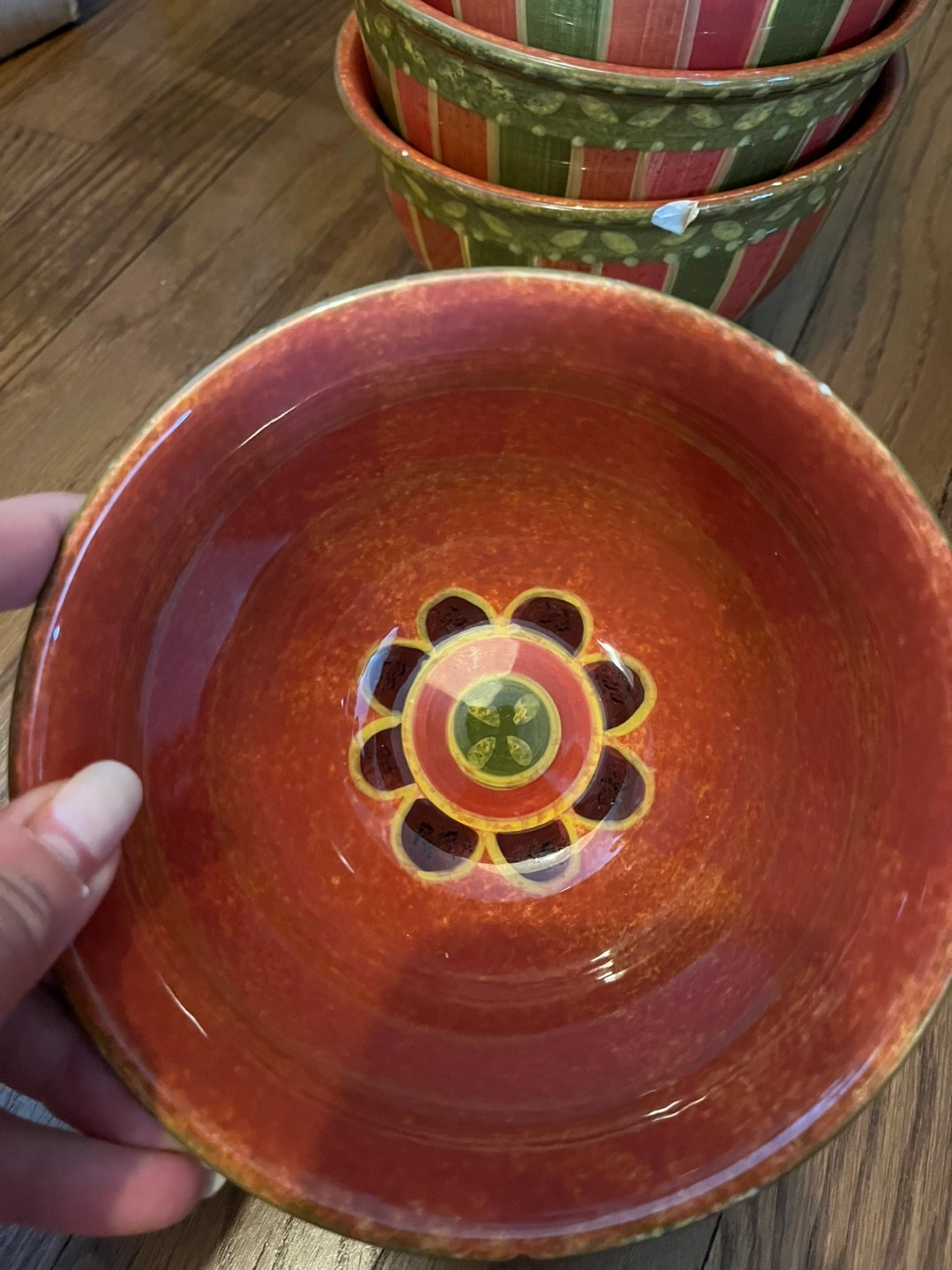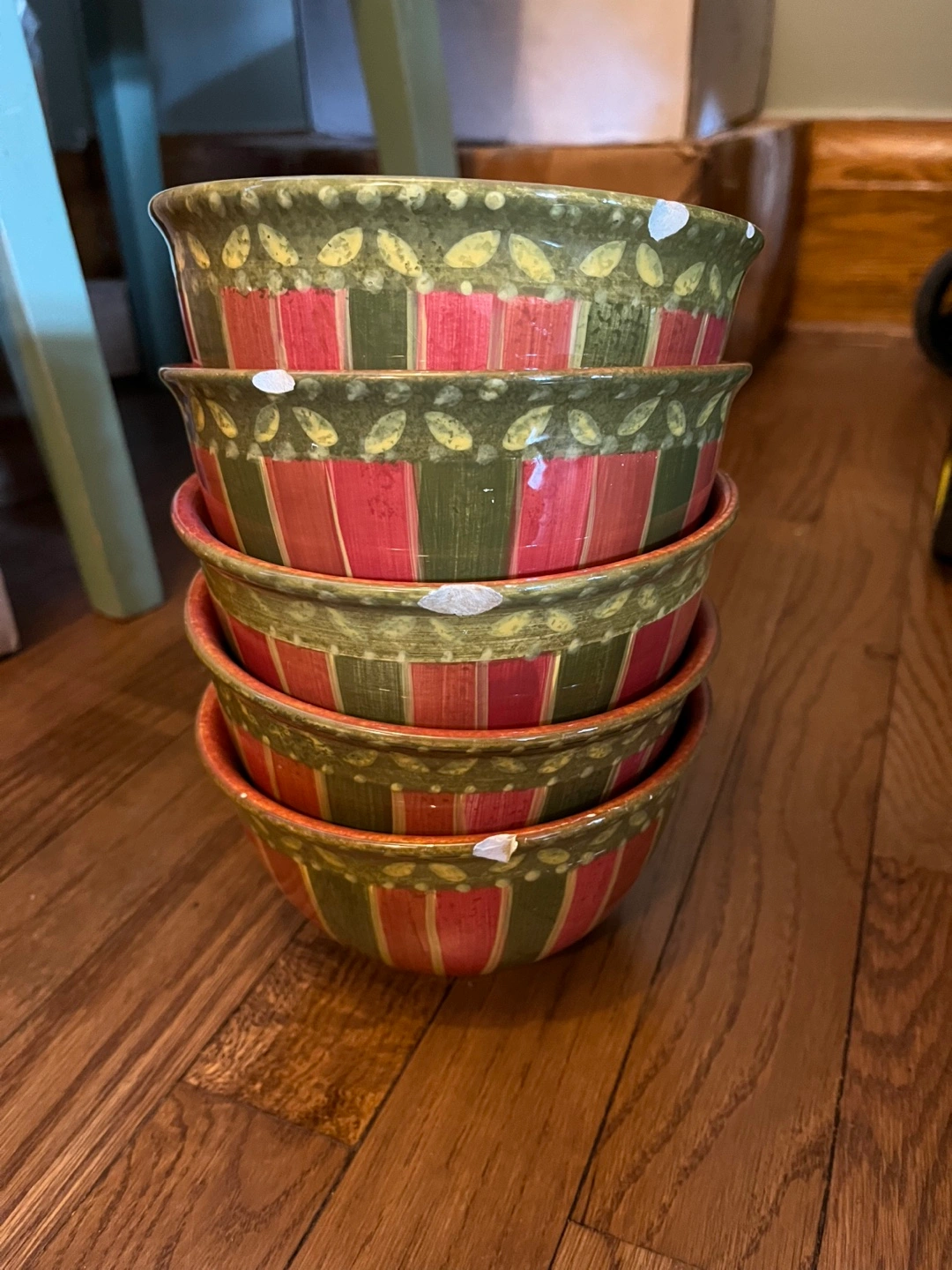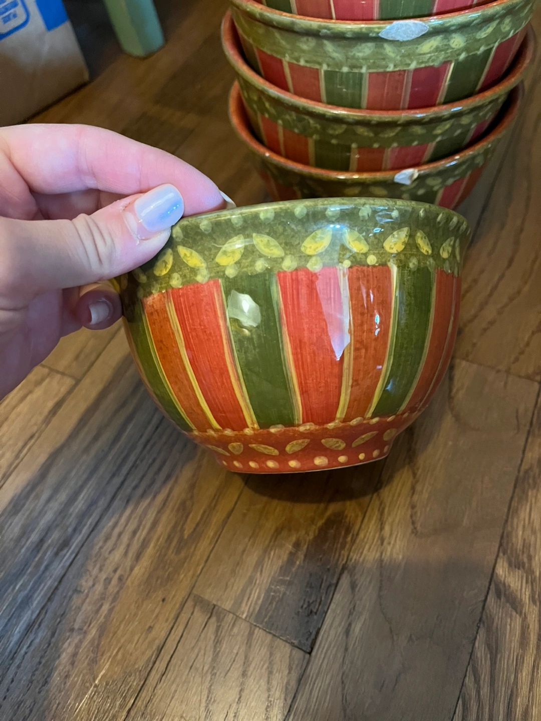 147I'm selling a set of 5 bowls. They have a striped pattern with green, red, and yellow colors. There are some chips on the edges of a few of the bowls. Very heavy and hearty bowls, perfect for cereal.