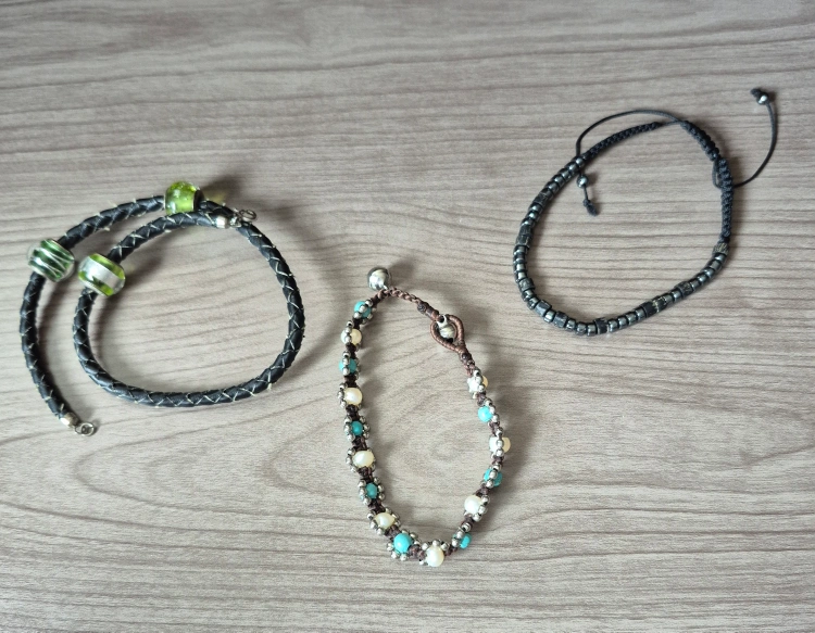 A set of three beautiful bracelets. One bracelet features braided black leather. Another is beaded with a mix of turquoise, and white beads. The last one is a dark color with squared-shaped beads. Simply wearing one of these bracelets can easily elevate any outfit, adding a touch of elegance to your overall look.