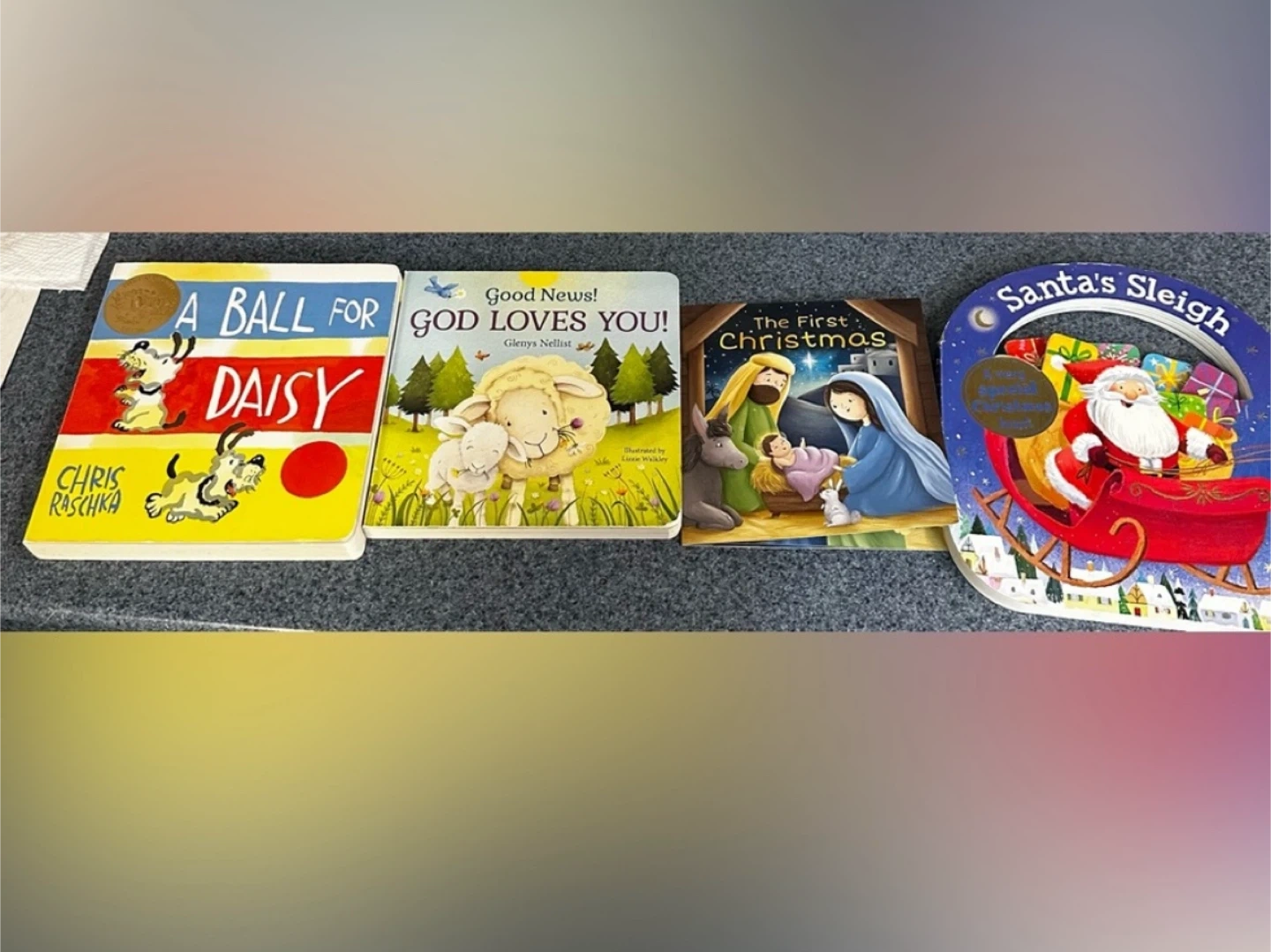 Selling a set of four children's books! Titles include: - A Ball for Daisy by Chris Raschka - Good News! God Loves You! by Glenys Nellist - The First Christmas - Santa's Sleigh