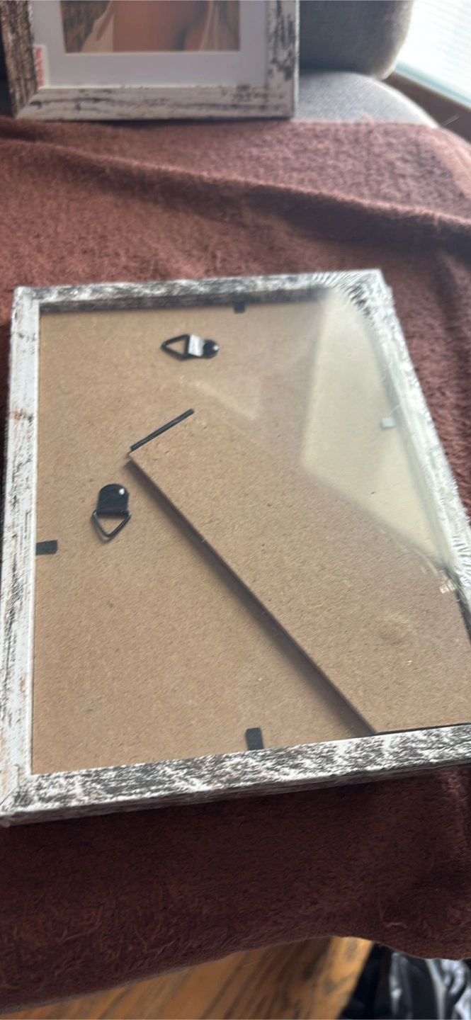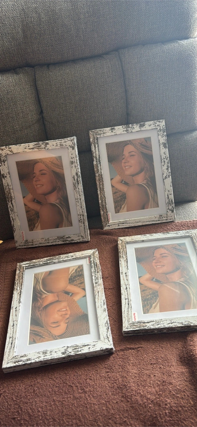 Four matching picture frames. Whitewashed wood finish. Each frame contains a print of a woman in a sunhat. Perfect for farmhouse decor. Pickup near 60th and Narragansett by midway airport