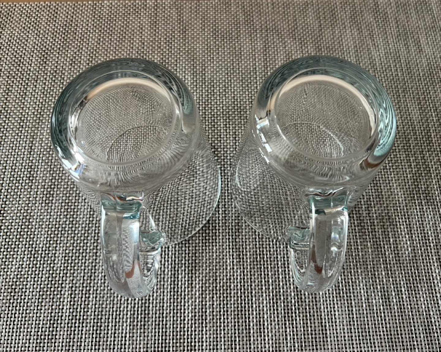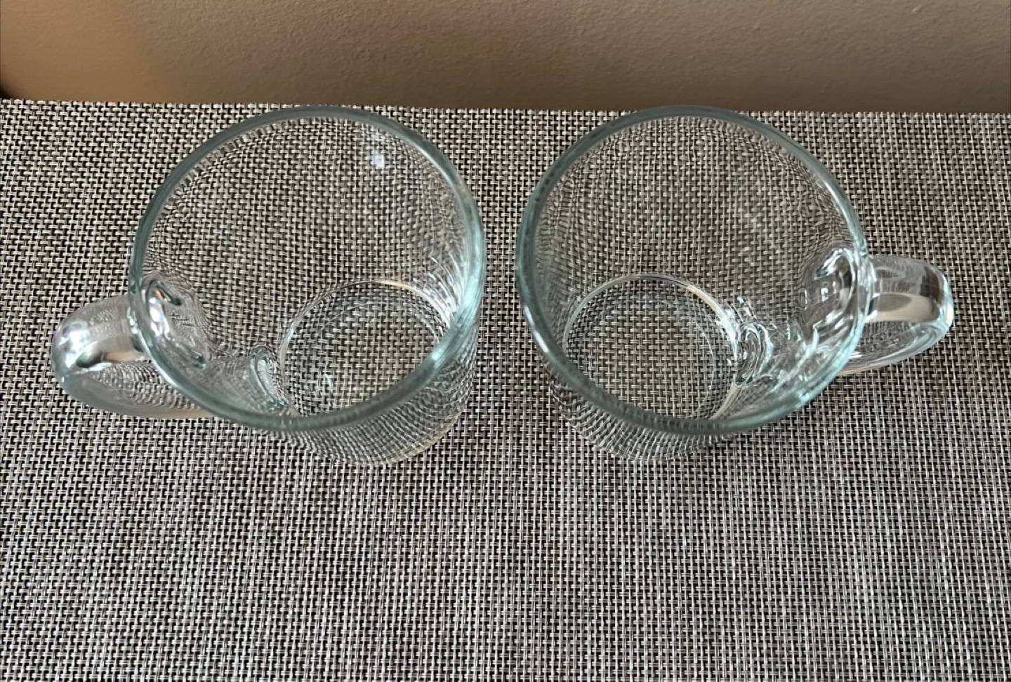 Used - in great condition. Merging 2 apartments and have too much glassware! 2 sturdy clear glass coffee/tea mugs Minor wear from normal use Dimensions: 4” H x 3.5” Diameter Pick up only near Astoria Park, Queens NYC 11102 Only Cash (preferred) or Venmo for payment Check out my other listings!