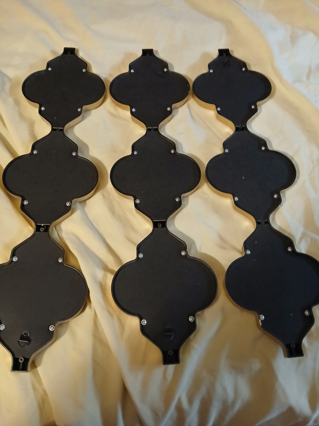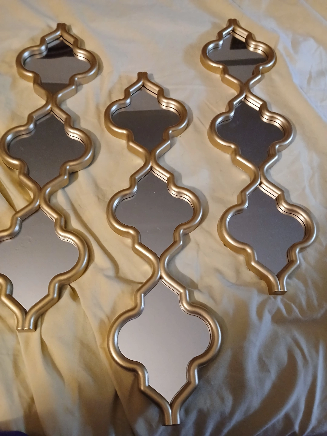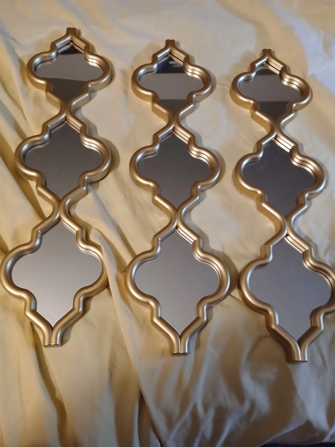 331Three gold-colored wall mirrors. Each mirror features a vertical arrangement of quatrefoil-shaped mirrors. Perfect for adding a touch of elegance to any room. Easy to hang.