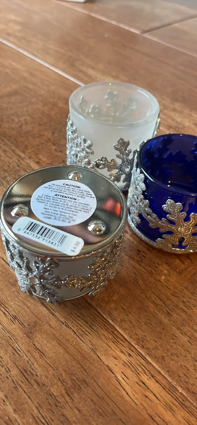 15I'm selling three Tealight candle holders from Pier One. They are decorated with snowflakes. Two are white and one is blue. Retail price each $4.50