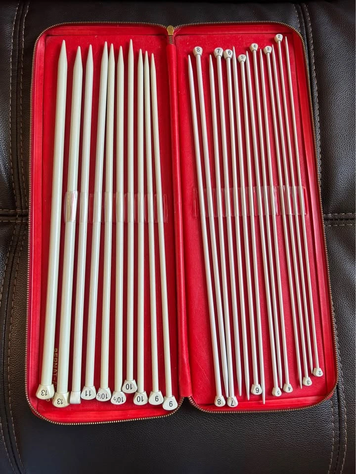60A set of vintage Bernat Aero knitting needles in a red case. Bernat Aero was a popular brand of knitting needles from the 1960s to the 1980s. The needles are single-pointed and made of plastic or aluminum. The set includes various sizes, which are marked on the end of each needle. Pick up on Belmont Cragin Hablo español