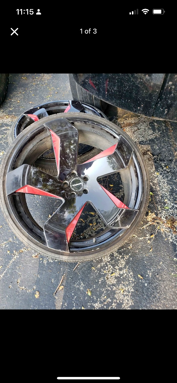 60Selling a set of wheels (minus1, rim cracked beyond repair) with black rims, sized 22' with 5 tires, They're in good condition and ready to be put on your car. Please take a look at the photos for more details! Also a a set of 4 22' tires, less than 3 months wear n tare, with Black b Red rims in good condition. Make & offer.