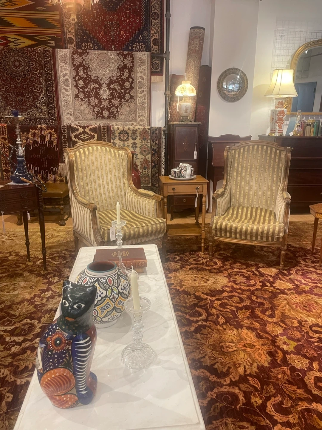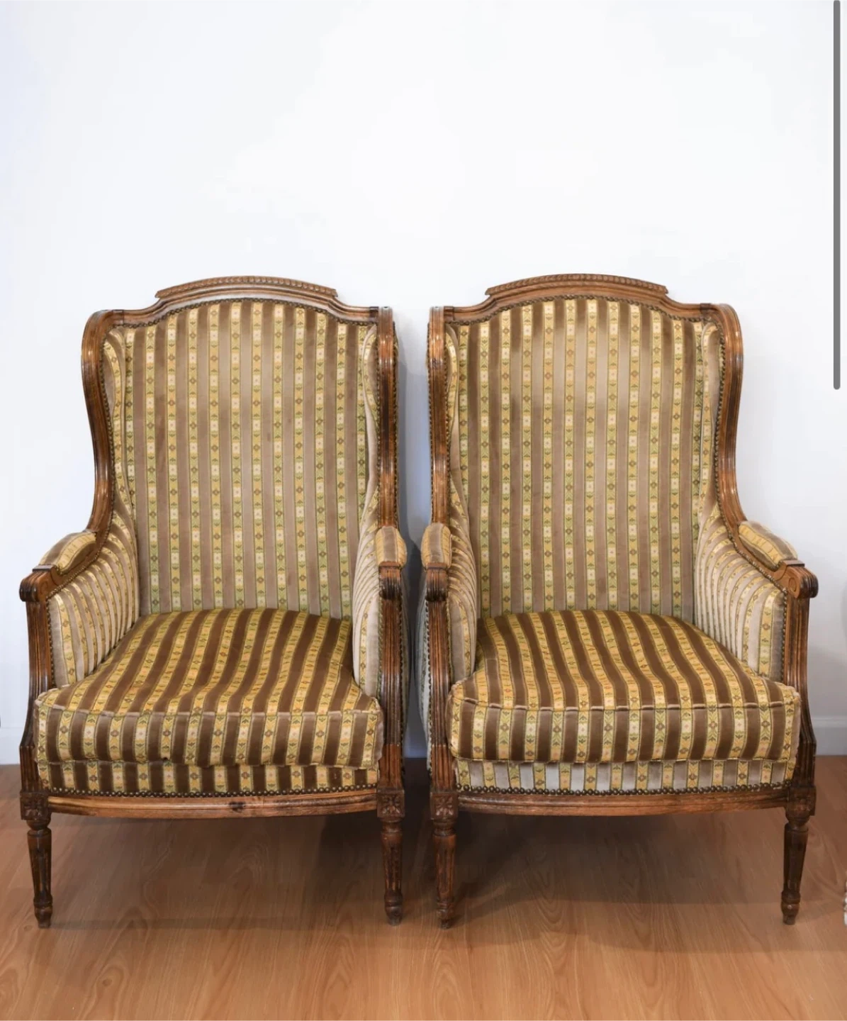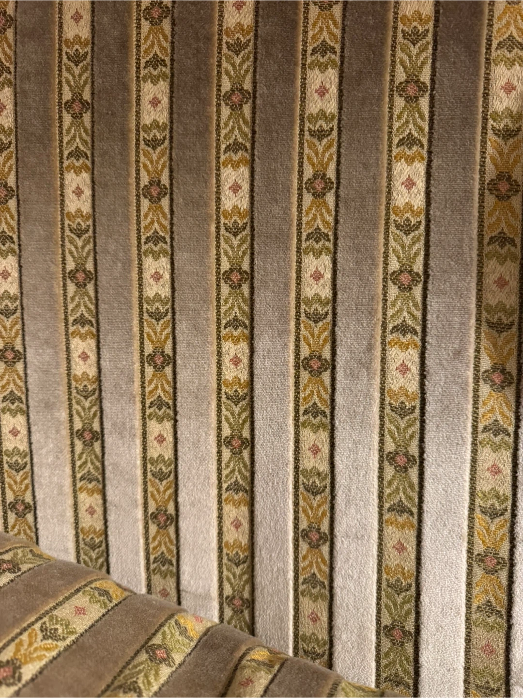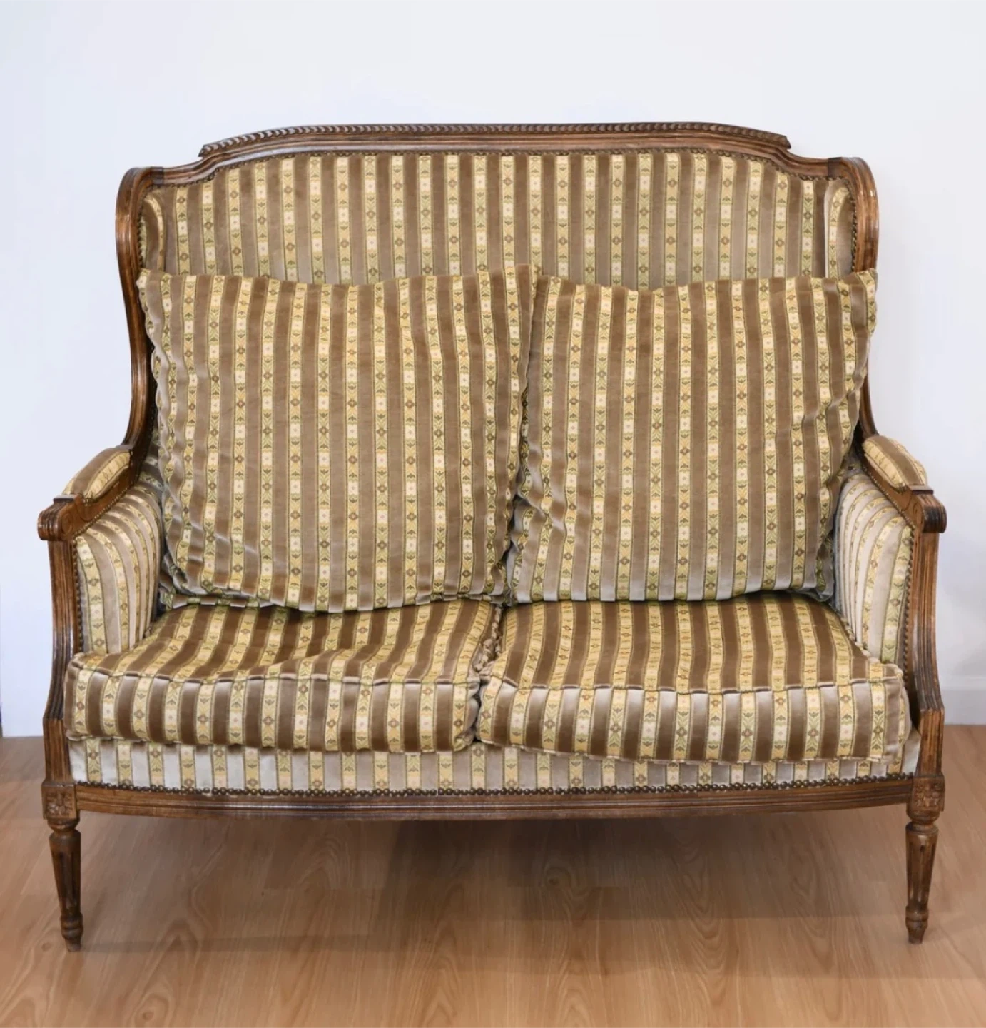 60Seating set that includes a Sette and (2) Lounge Chairs in Jansen Style Louis XVI with Velvet and Silk Striped Fabric fashioned as a Living Room Suite Set - Great Condition - Professionally Cleaned Upholstery Dimensions: - Settee 48”L x 26”D x 42”H - Chairs 26”L x 26” D X 42” H Delivery service available from $135 depending on location in NYC.