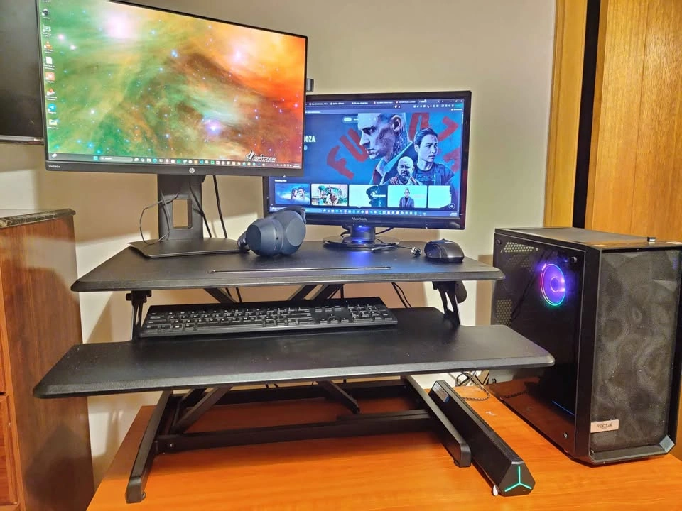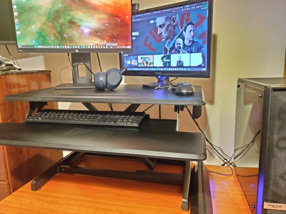 21Upgrade your workstation with this Seville Classics AirLIFT® PRO Sit-Stand Desk Converter! Smooth pneumatic lift lets you easily switch between sitting and standing positions. Perfect for dual-monitor setups, as shown in the photos. Sturdy build and smooth motion. Two-tier design: spacious top surface for monitors, and lower tray for keyboard & mouse Ergonomic lift handle for effortless height adjustment Heavy-duty steel frame for stability Ideal for home office or gaming setups Supports up to 33 lbs Color: Black Condition: Used lightly in a smoke-free home. Mechanism lifts smoothly and stays steady at all heights. No dents or scratches. Dimensions: Approx. 35.4” W × 23.2” D × adjustable height (6.2”–19.1”)