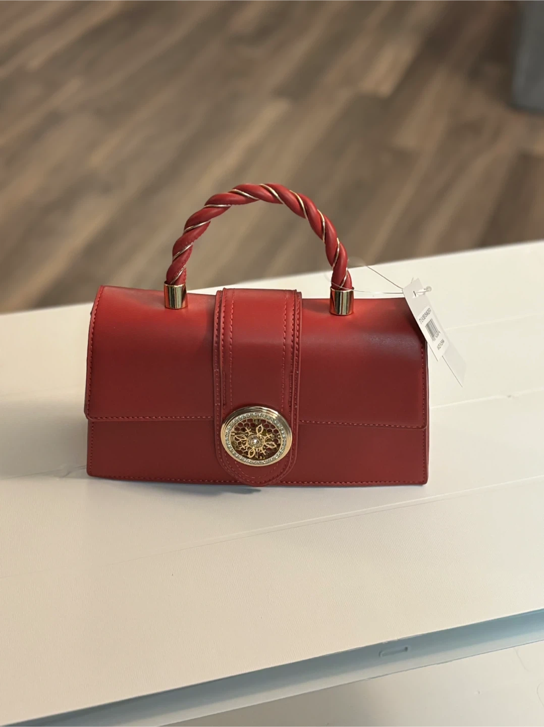 This women's handbag features a stylish twisted rope handle and a decorative gold-tone clasp. It's made of faux leather and comes in a vibrant magenta. This bag's compact size makes it perfect for essentials.