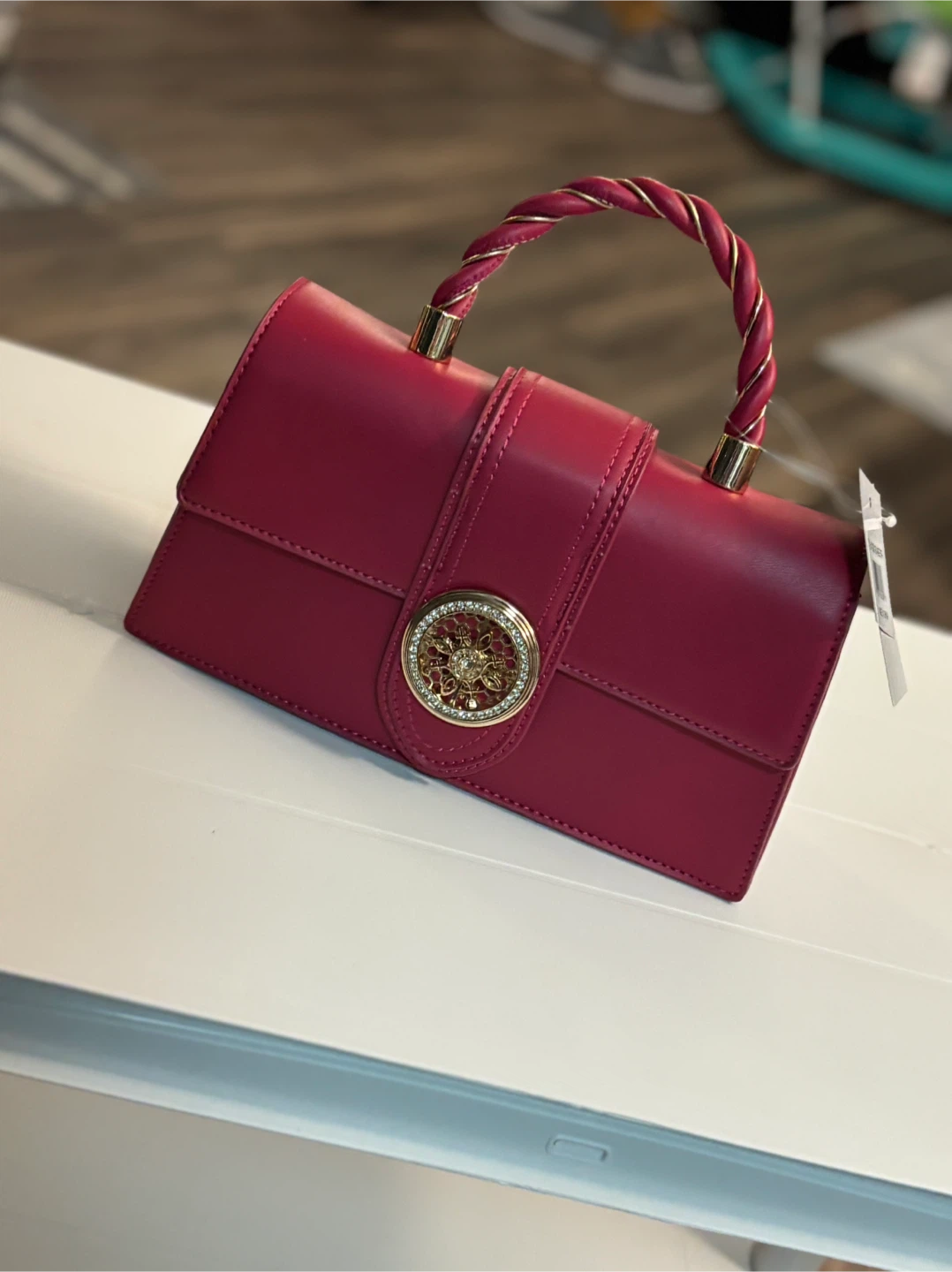 This women's handbag features a stylish twisted rope handle and a decorative gold-tone clasp. It's made of faux leather and comes in a vibrant magenta. This bag's compact size makes it perfect for essentials.