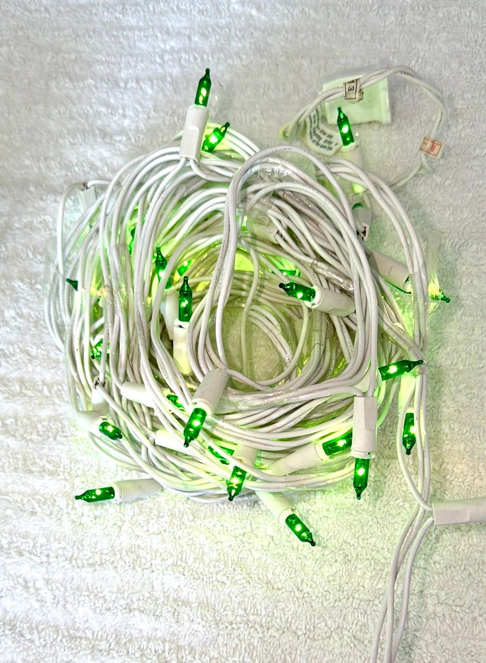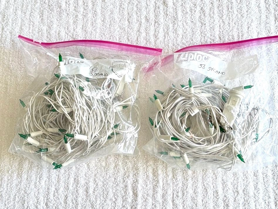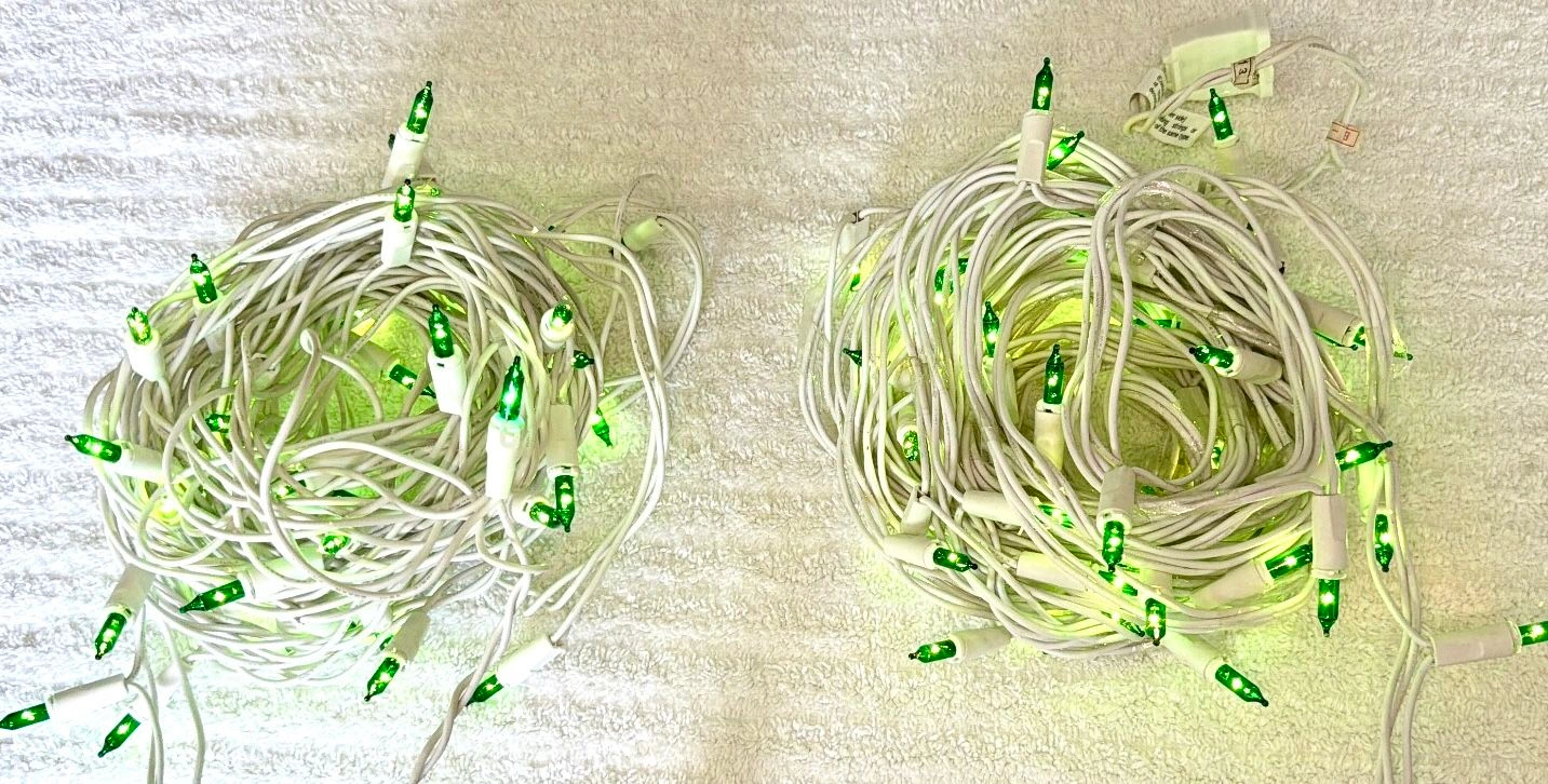 New, 2 Sets of 50 lights, without original box. White cord, green Christmas lights. Use for Christmas or any other celebration! 100 lights total! Tested and fully functional. UL listed. I also have a 3 piece set of 100 light strands in green color if you need additional. Message me to arrange the purchase. Cash only sale, buyer must pick up from the Morton Grove Area.