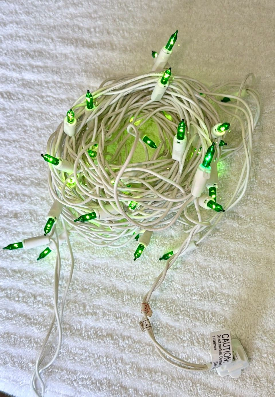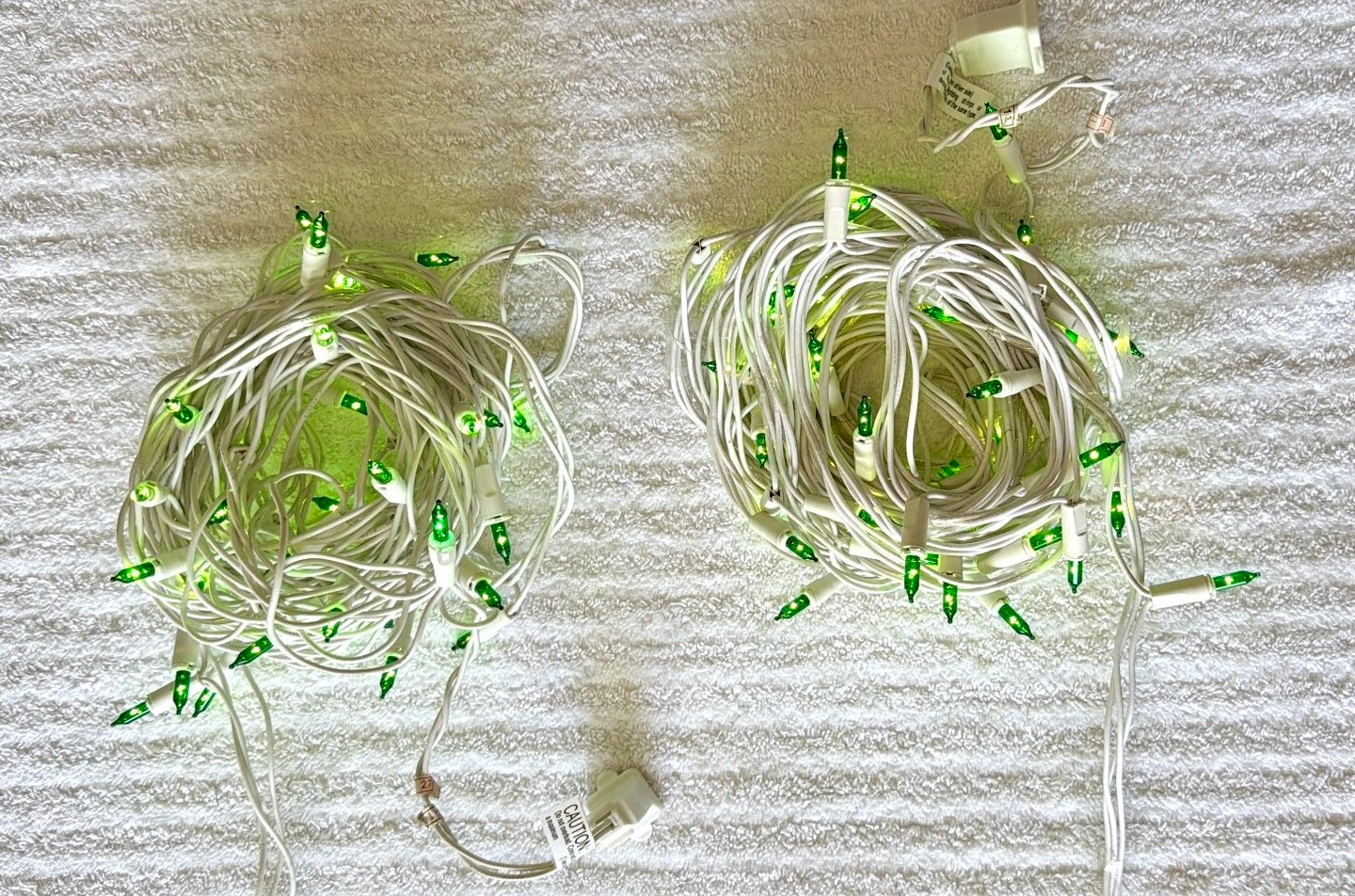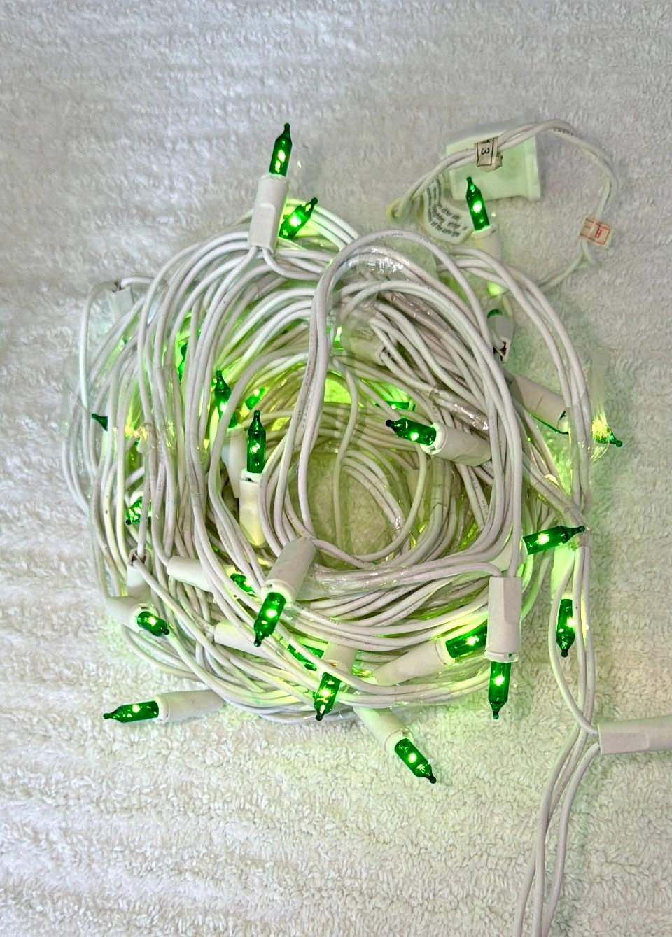 New, 2 Sets of 50 lights, without original box. White cord, green Christmas lights. Use for Christmas or any other celebration! 100 lights total! Tested and fully functional. UL listed. I also have a 3 piece set of 100 light strands in green color if you need additional. Message me to arrange the purchase. Cash only sale, buyer must pick up from the Morton Grove Area.
